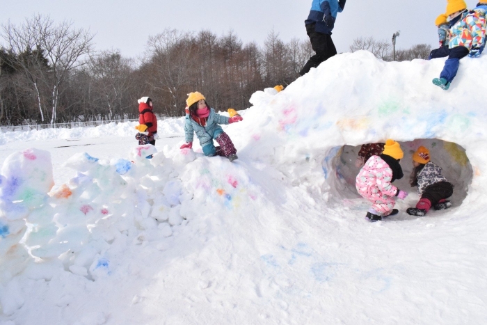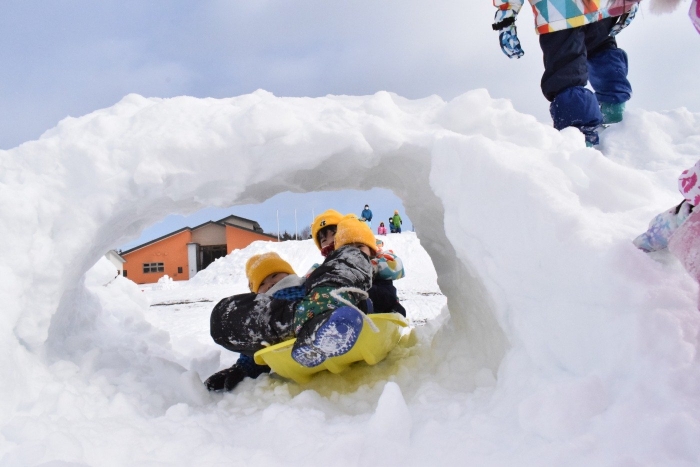 さくら組に触発されたのか、今日はもも組やうめ組のお友だちもスコップやバケツ、そりを用いて雪の壁を作っている姿がありました。なんでも興味をもってやってみることはとても大事なことで、知育につながりますね~また、さくら組のお城は色水で着色してとてもきれいに見えます。今日はそり滑りのときに滑り降りた先にトンネルアーチをつくりそこをくぐれるようにしました。うまく狙いを定めてアーチをくぐることができたお友だちもいましたよ。