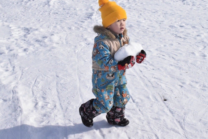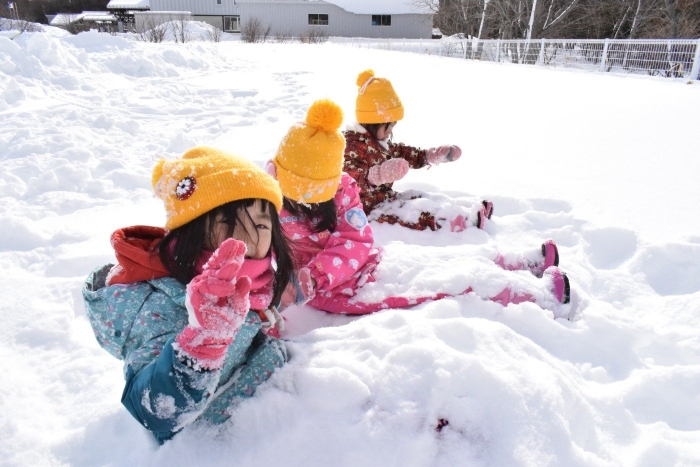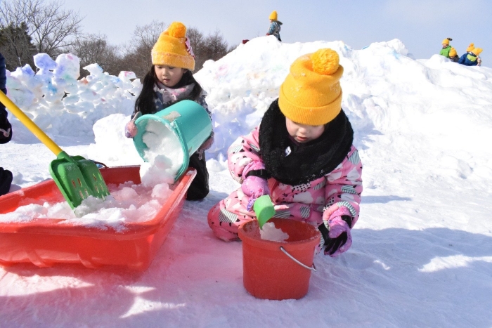 雪を水で濡らしてバケツに入れそれを積み上げる子も。