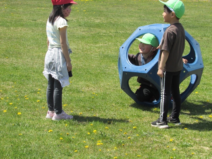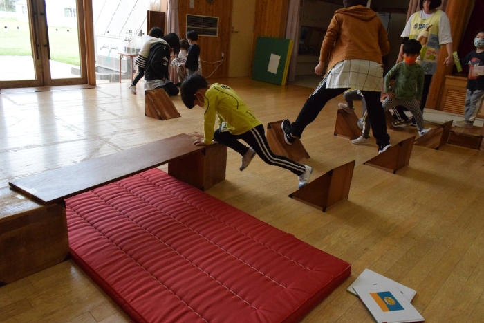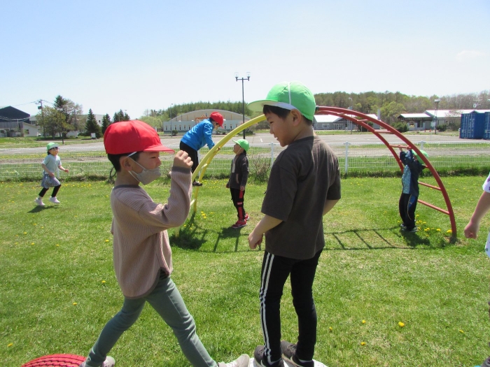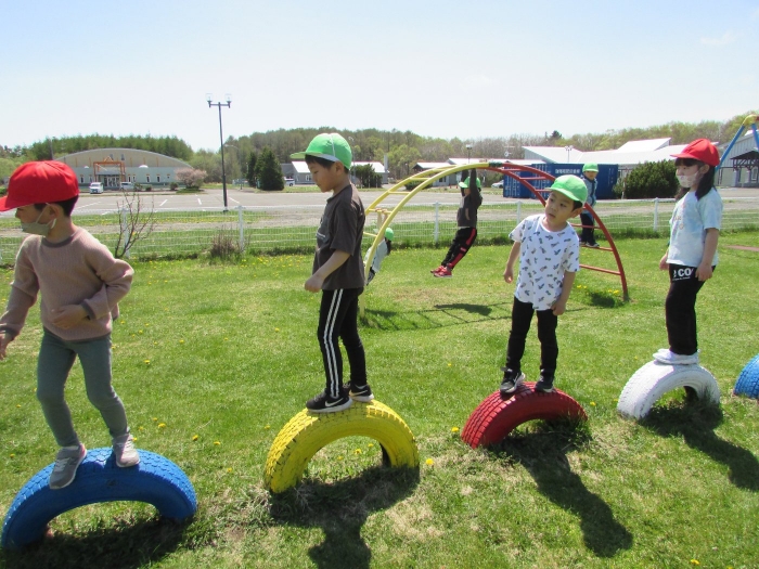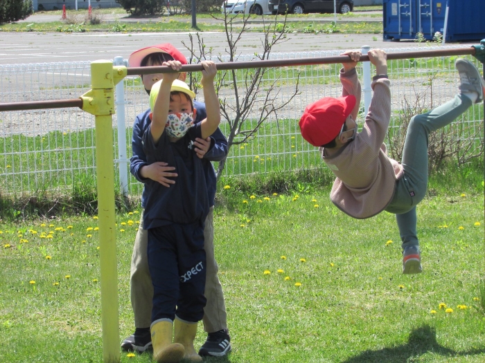 今日もさっそくアスレチックに向かう子どもたち。昨日の遊びから「スタートがあったらいい」「ゴールもいる」とみんなにわかるように貼り紙をしてチャレンジを楽しむ姿がみられました。必要な物を自分たちで考え、遊びをもっと楽しいものにしていこうと日々進化させながら無自覚のうちに学びを深めていっている子どもたちです。