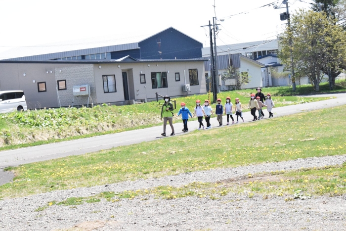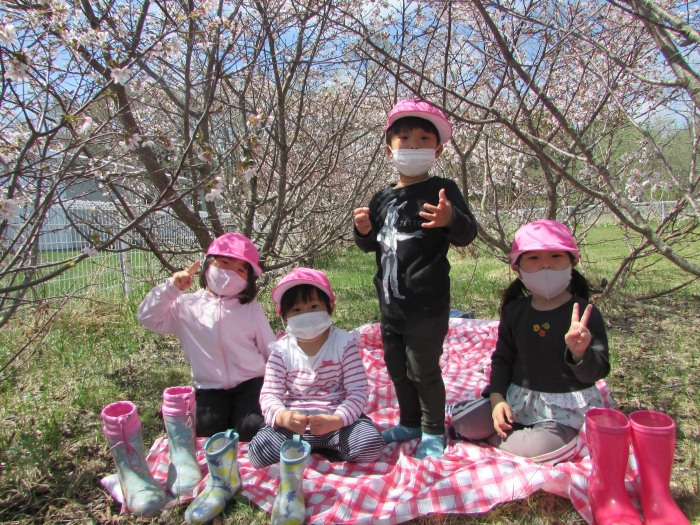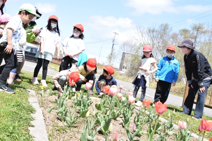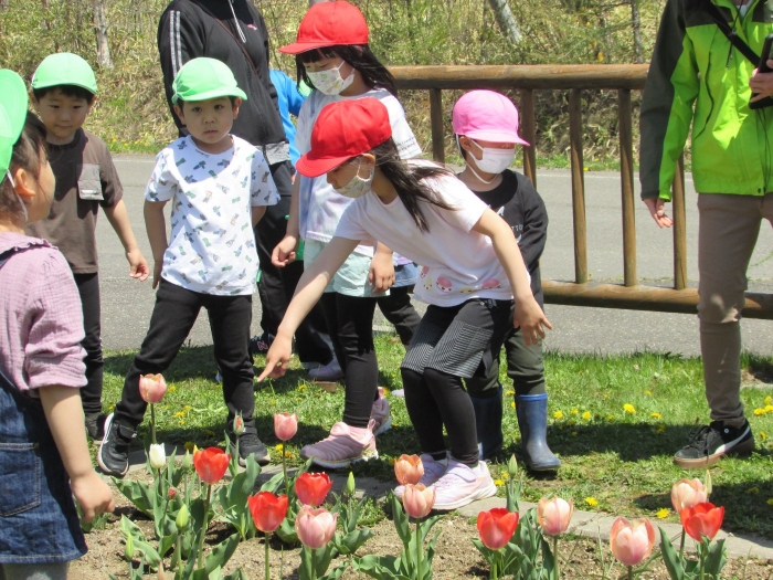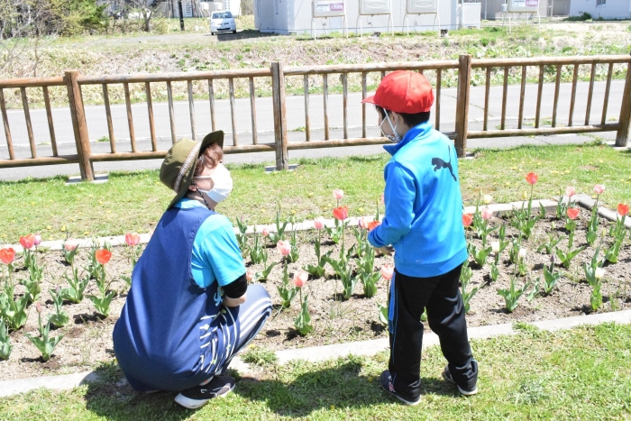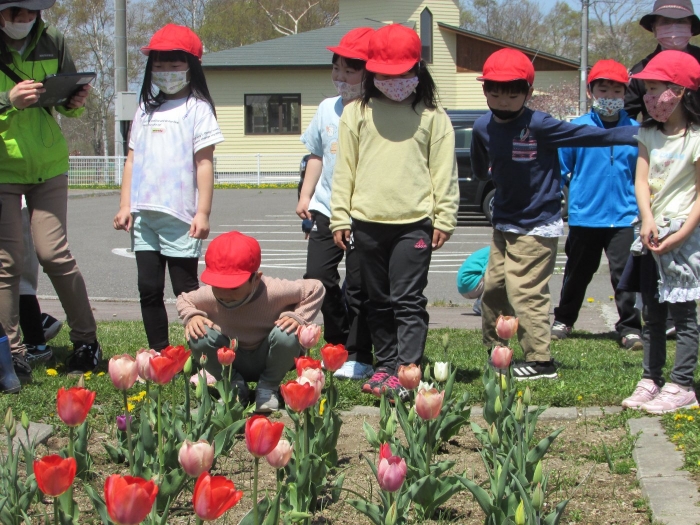 昨日は小学校へ千島桜を見に出かけ思いがけず小学生と交流することができましたが、今日は一年生が幼稚園に来てくれました。昨年さくらさんのときに植えたチューリップが咲いたことを知って見に来ましたよ。