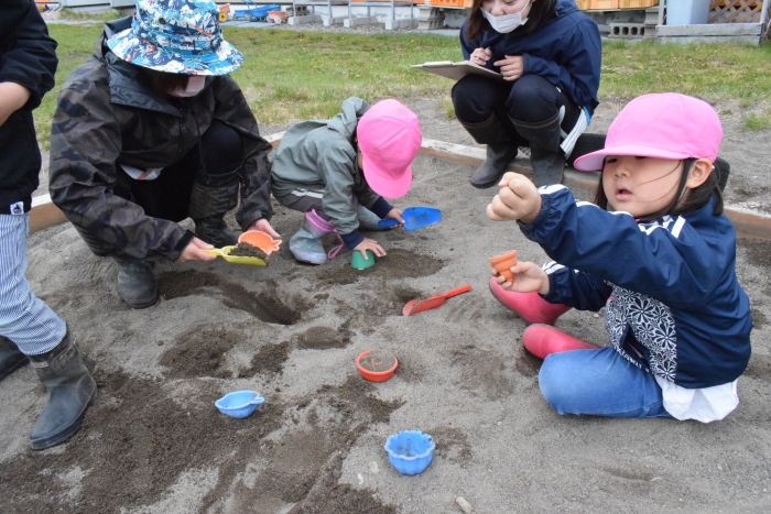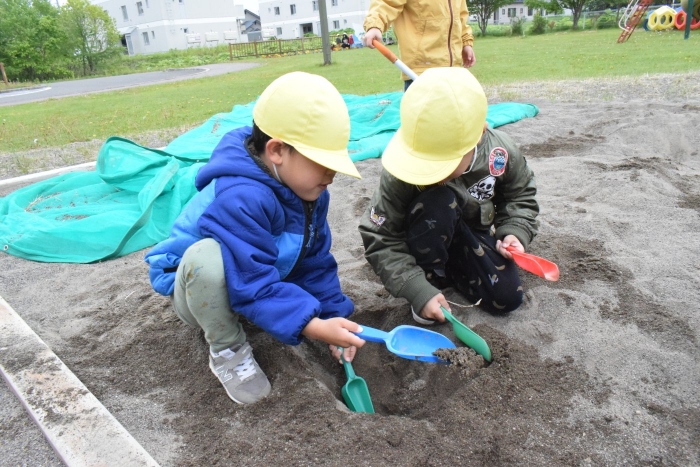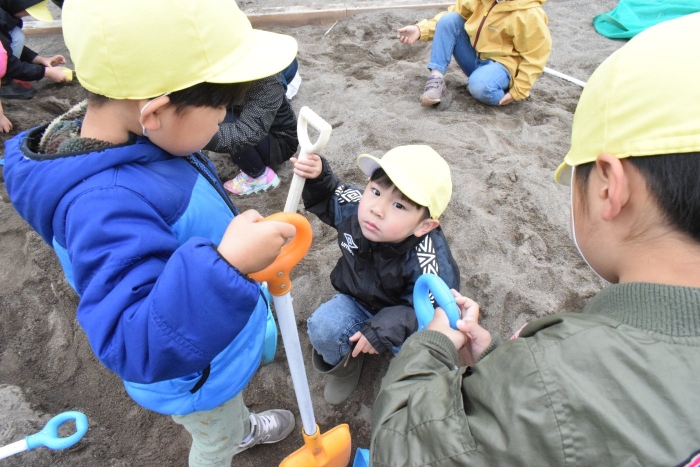 ももさんは同じスコップを持って、共同作業。