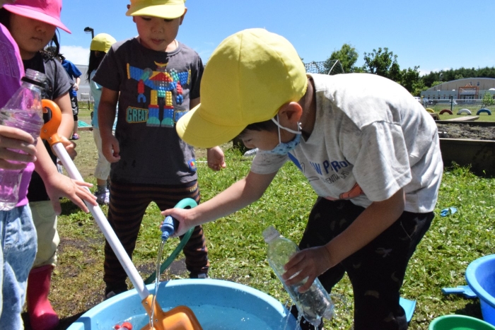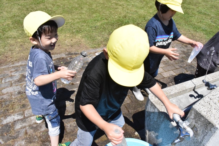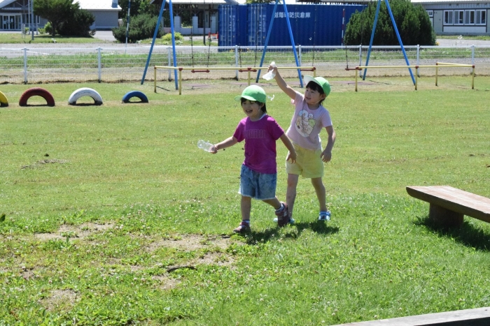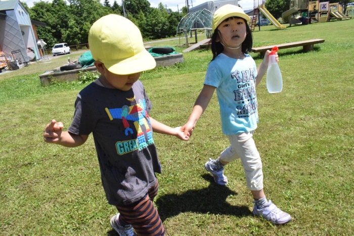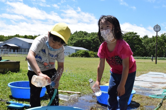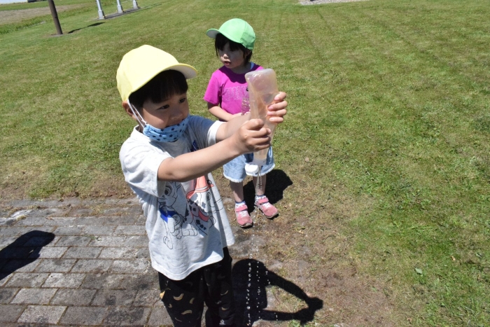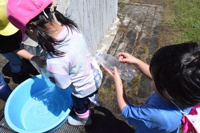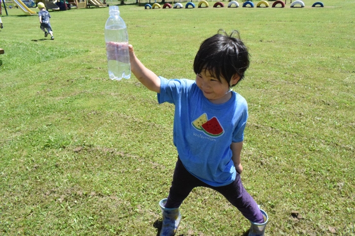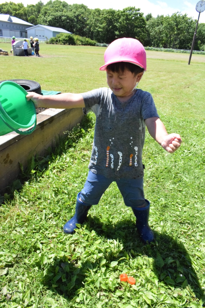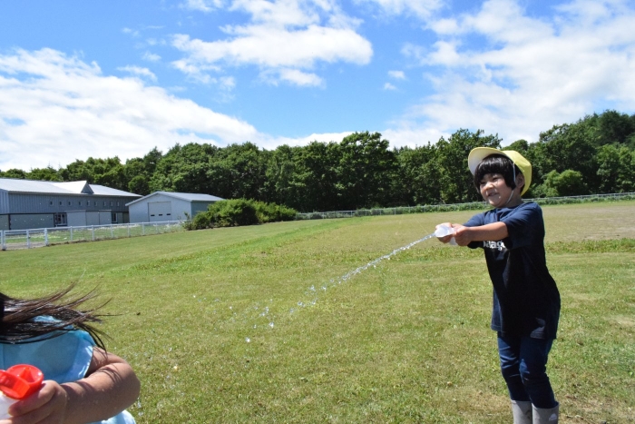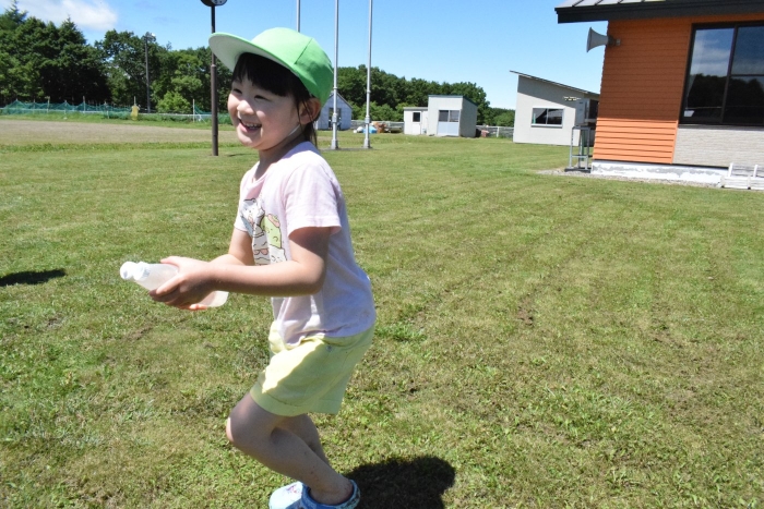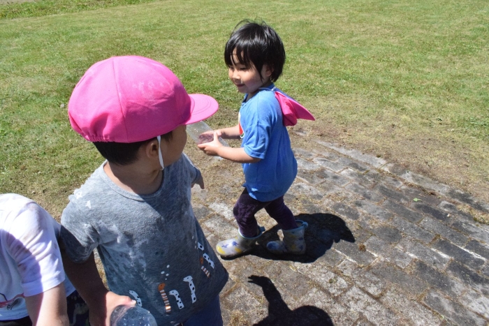 今日は久しぶりにいいお天気に恵まれました。外で遊べるのも今日で最後、こんな日は水遊びしたい!ということで水鉄砲で大暴れ(>_<)。撃たれないように逃げまわったり、攻撃の的を探しまわったり、思いっきり夏の遊びを楽しんでいました。