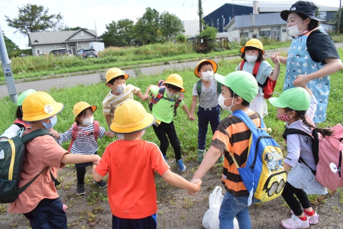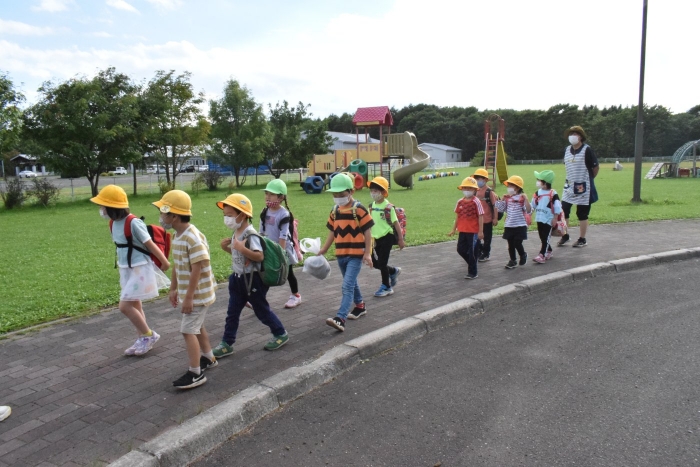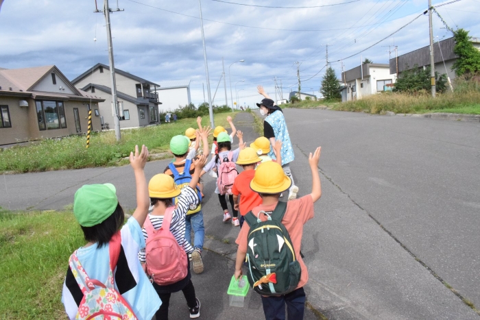さくらさん徒歩降園始めました! 2022年08月30日(火) 日々のできごと 昨日からさくらさんが就学に向けて、徒歩で国道近くの空き地まで歩く練習を始めました。短い距離ですが子どもたちにとっては歩きごたえがあるようです(>_<) 歩くのが楽しくて、朝も空き地から歩いてくる子もいました。親子で歩く時間も大切なコミュニケーションの時間だと思います。天気の良い日はさくらさんに限らず、うめさん、ももさんもウオーキングやってみてはいかがですか?新しい発見もあると思いますよ(^^)/ みんなで一緒に歩いて帰れるの嬉しいね。 交通ルールを再確認しながら。 お母さんが待ってる空地へ。 明日も元気でさようなら!