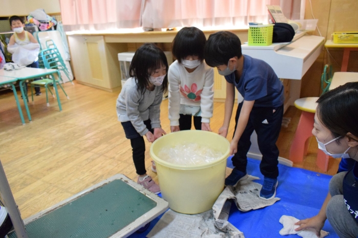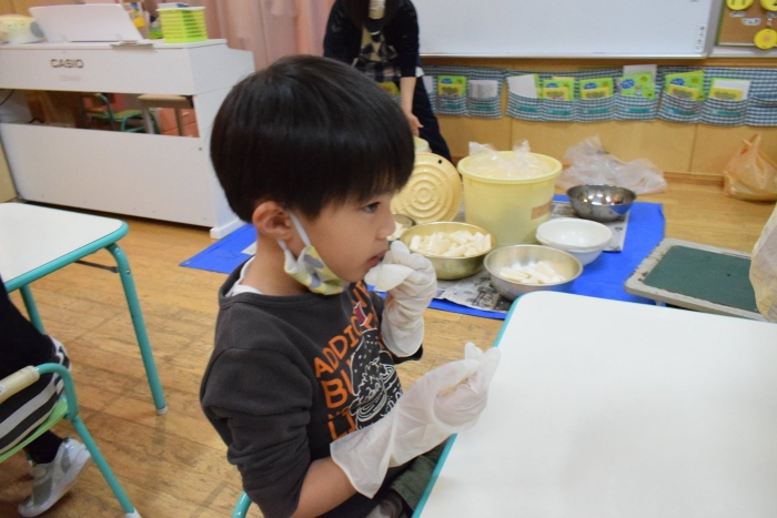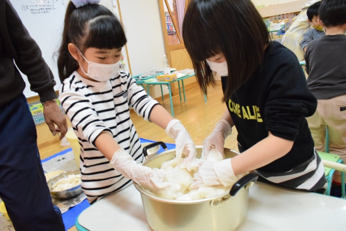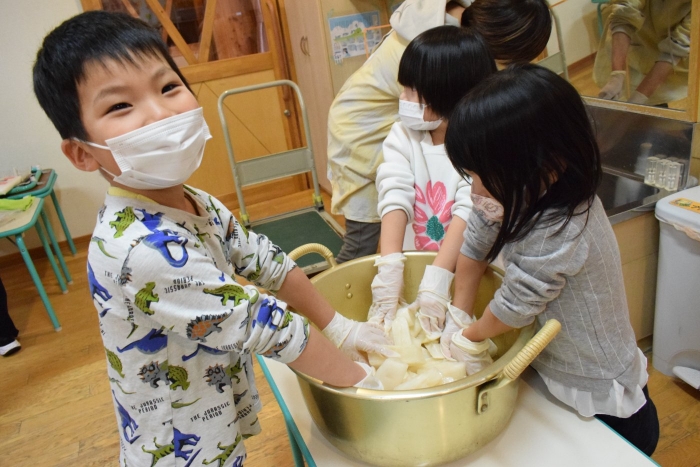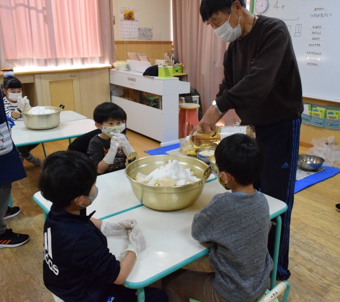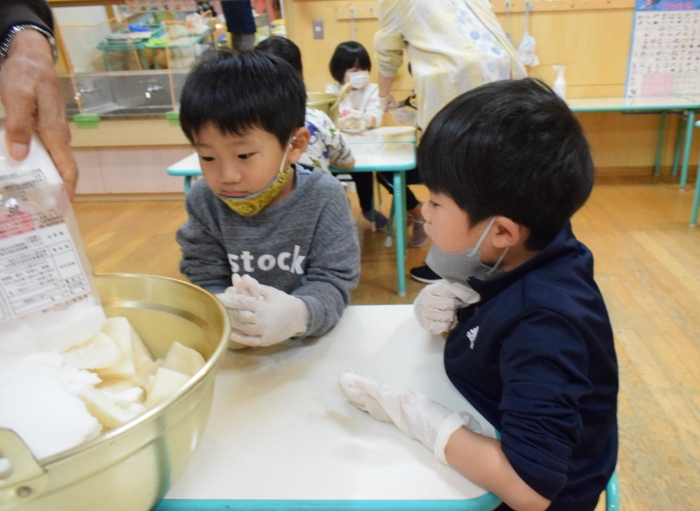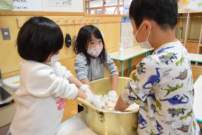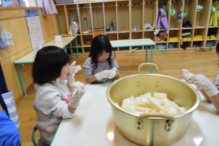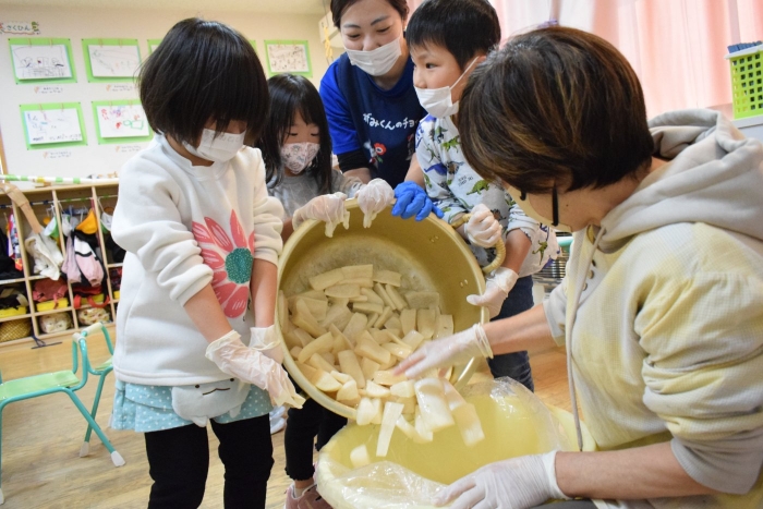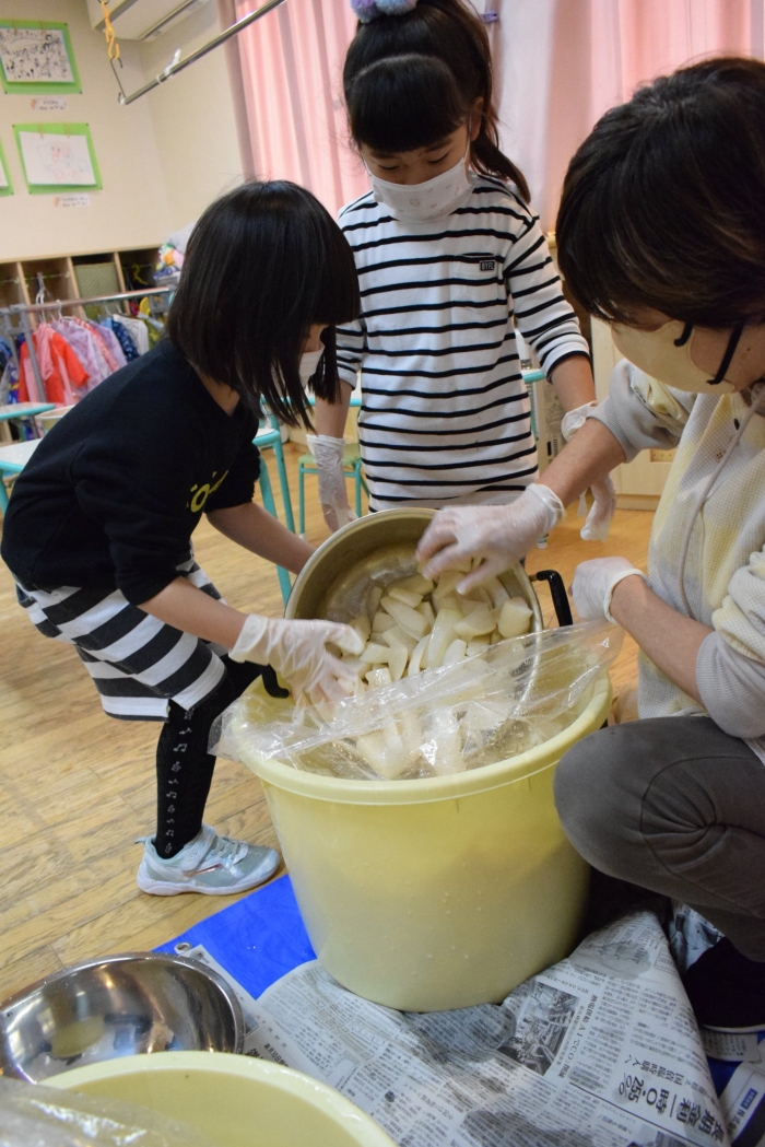 味付けは砂糖とお酢のみ。自分たちで抜いて、洗って、切って、漬物になるまでの過程をしっかり学ぶことができました。14日頃には漬けあがるそうです。今から楽しみにしている子ども達です。