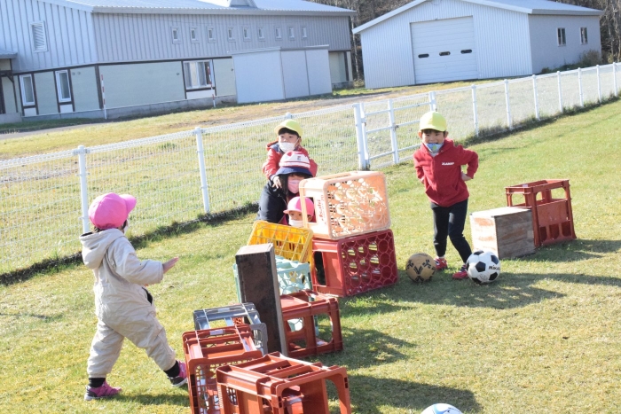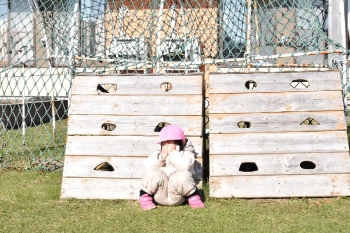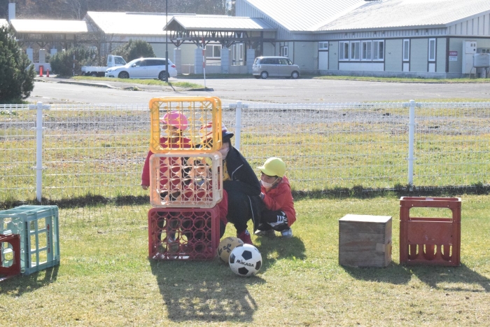 外ではかくれんぼが!園庭からグランド、物置小屋の方まで隠れる範囲が広~い(>_<) いつになったら全員捕まるのか!?