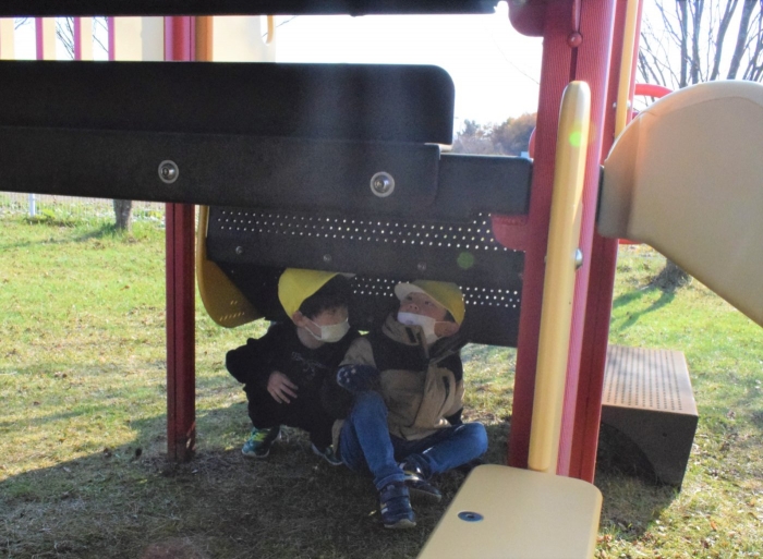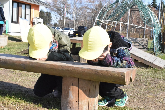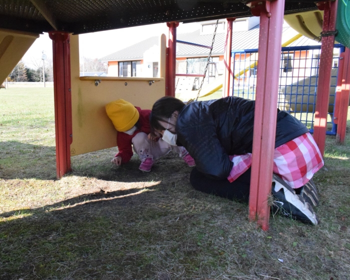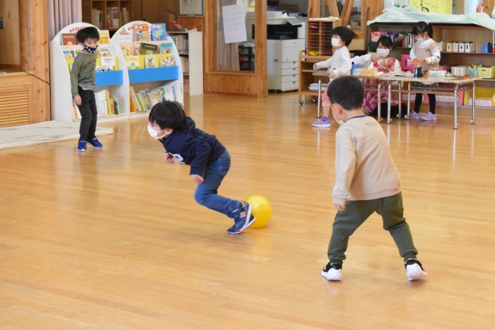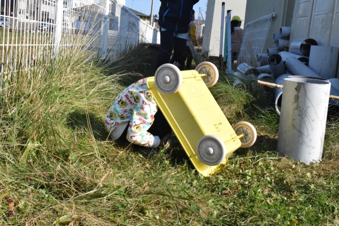 外ではかくれんぼ?とおもいきや、かくれんぼをやりたい子と鬼ごっこをやりたい子がいて、「そうだ、一緒にやればいいんだ!」と、かくれんぼと鬼ごっこを合体させた『かくれんぼ鬼ごっこ』が新たな遊びとしてエントリー(^^♪ みんなで遊ぶために子どもたちは「ああすればいい」「こうすればどう?」といろいろできそうなことを考えたり、ルールも考えたりしながら、うめさん、ももさん、さくらさんが入り混じって広い園庭を走り回っている姿にたくましさと思いやる気持ちの育ちを感じました。