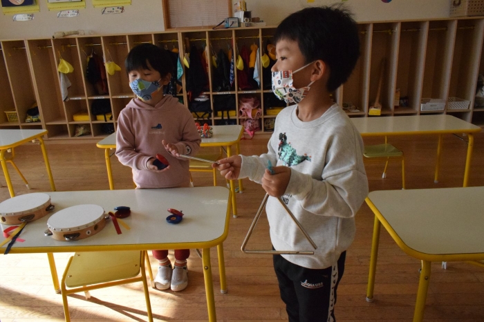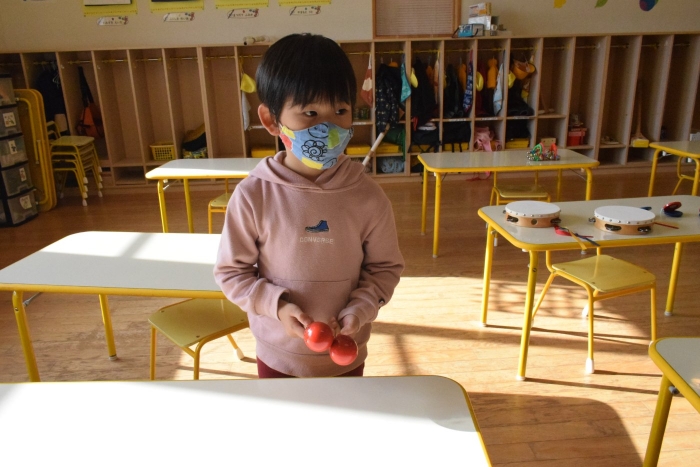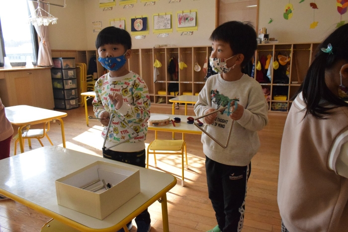 ももさんも楽器遊びをしてみました。いろいろな楽器を出してみると、さっそく興味のあるものを手に取って鳴らしていましたよ。まずはどんな音がするのか?どの楽器が好きか?いろいろ試してみましょう。