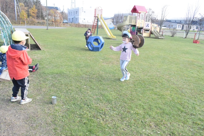 さくらさんは外で「缶蹴りしよう!」のお友だちの誘いに集まってジャンケンが始まりましたよ。天気は良かったのですが気温は低かったのでみんなで走り回って体を温めていました(^_-)-☆