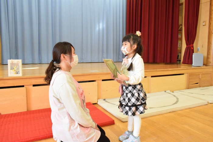 10月11日から一カ月間教育実習に入っていた小笠原眞子先生が今日で無事実習を終え、みんなとお別れすることになりました。1っカ月も一緒にいたので「なんで?」と不思議がる子もいましたよ。たくさん遊んでもらってすっかり仲良くなったのにお別れするのは寂しいですが、夢だった幼稚園の先生になるためにこれからピアノの試験を受けたり、標津の「あおぞら」で働きながら通信教育を受けたりして頑張るそうです。
