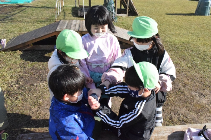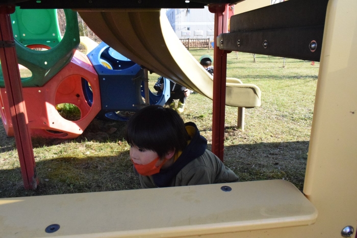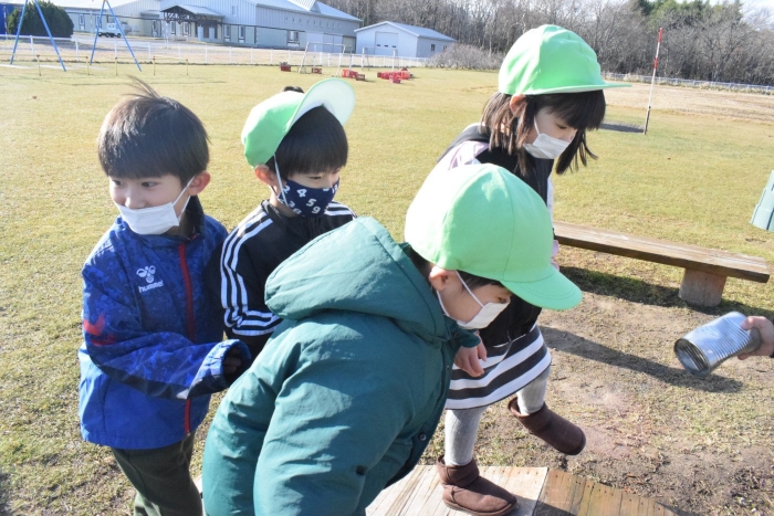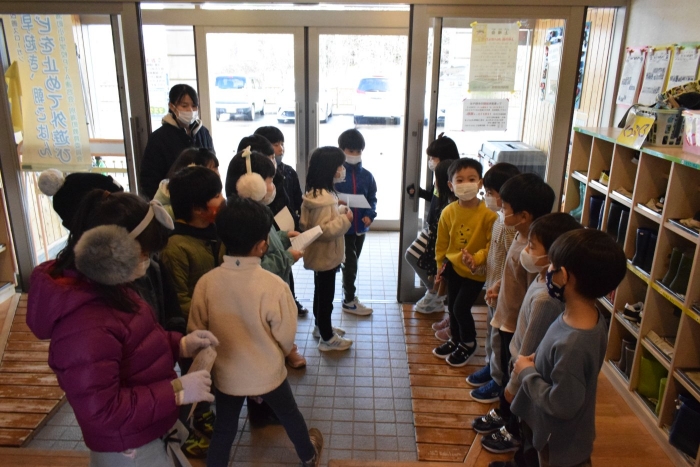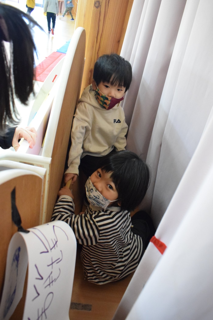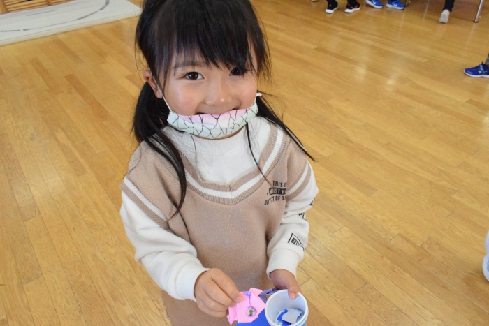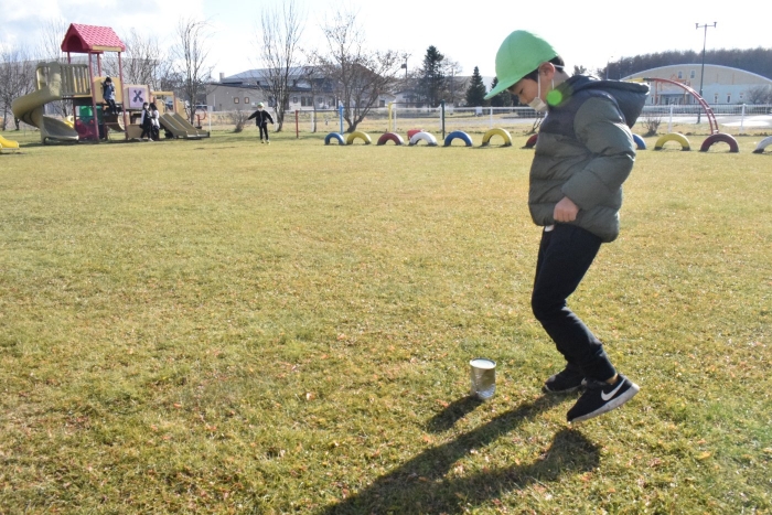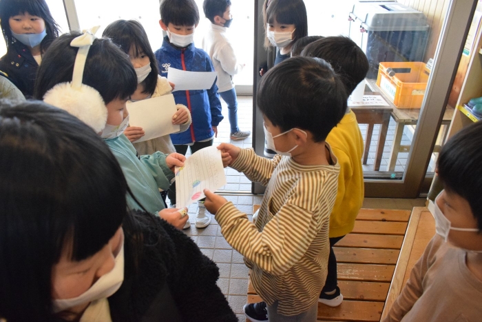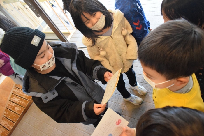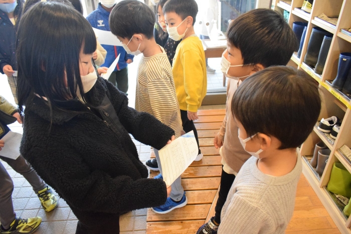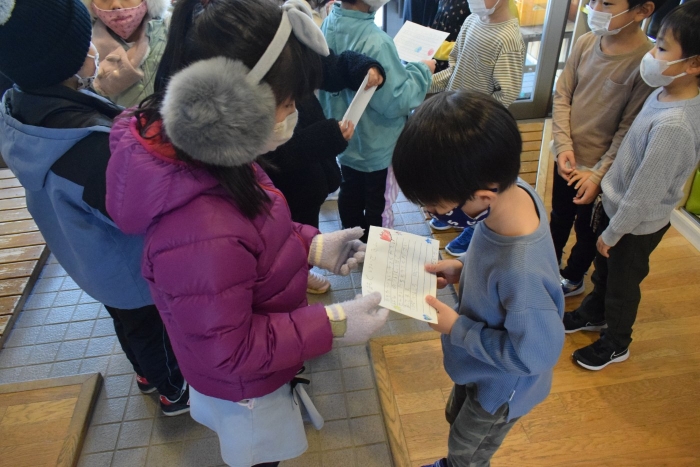 1年生が「おもちゃランド」の招待状を届けに来てくれました。嬉しいお誘いにさくらさんは大興奮! せっかく来てくれたのでそのまま外で一緒に遊びましたよ。さくらさんから「缶蹴りしよう!」と誘って短い時間でしたが懐かしく楽しいひと時がもてました。