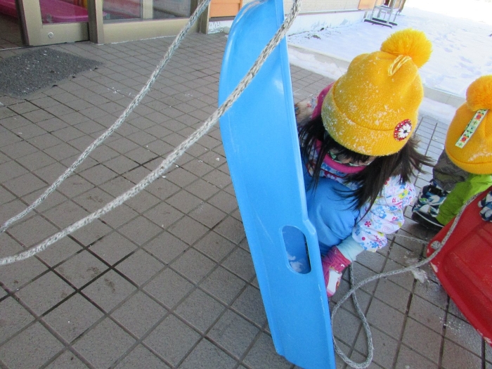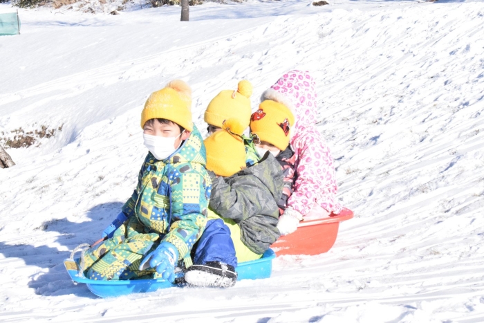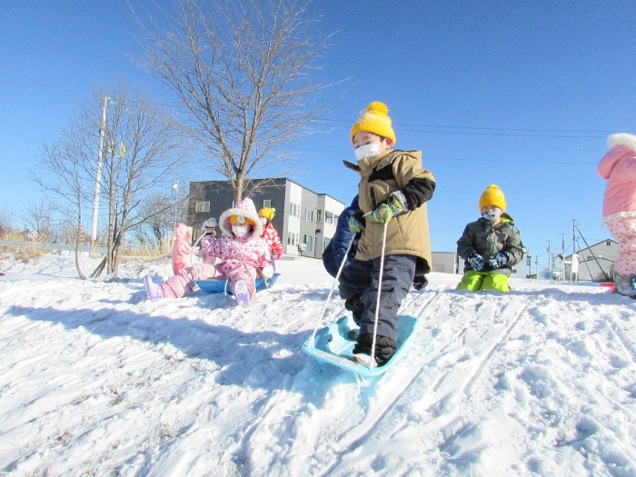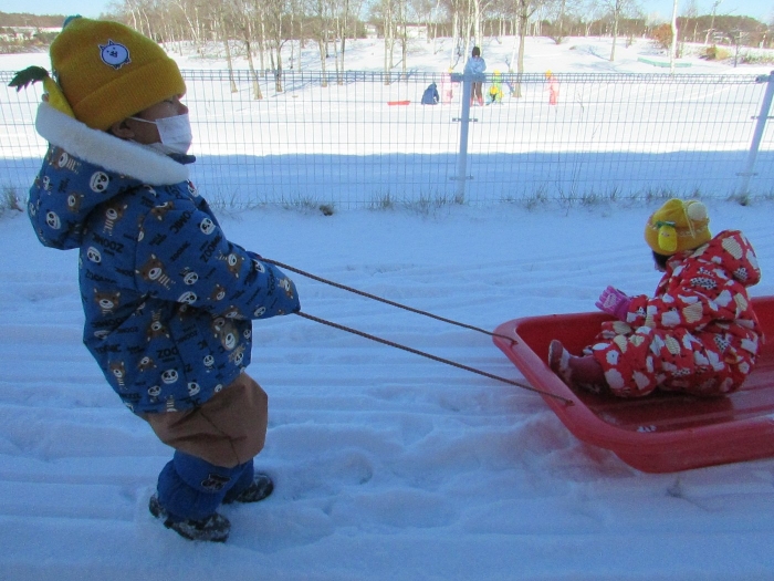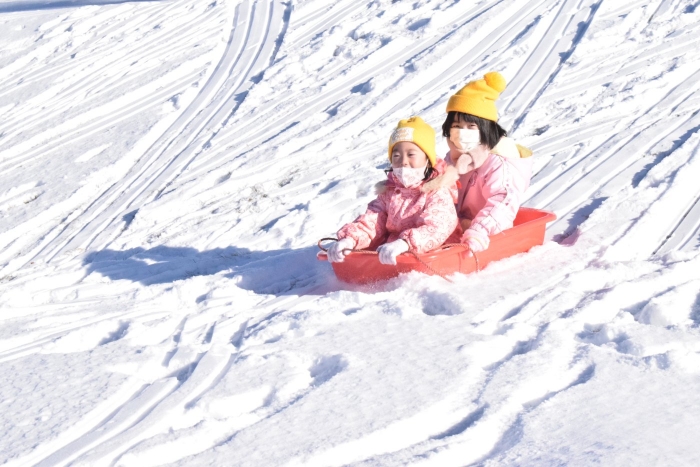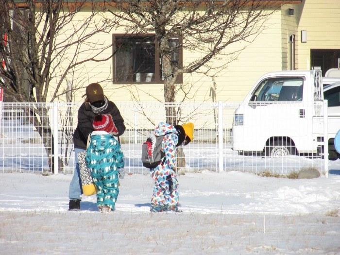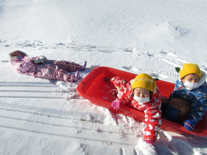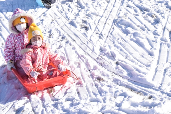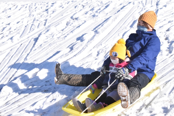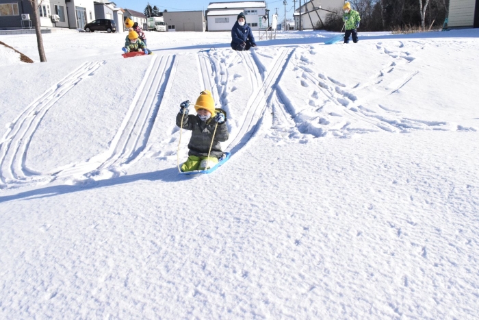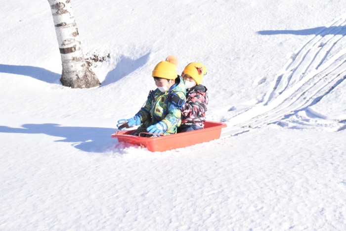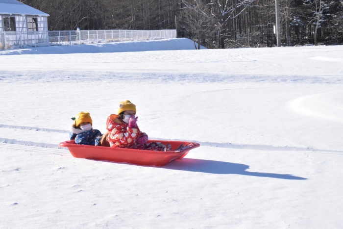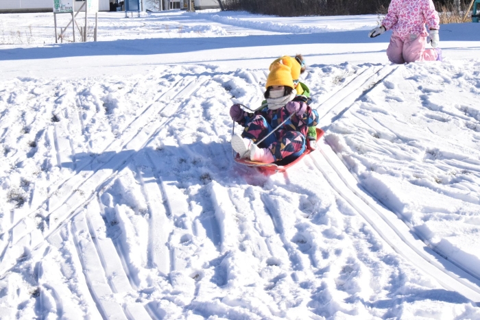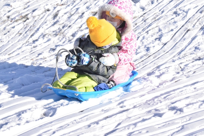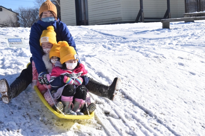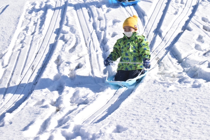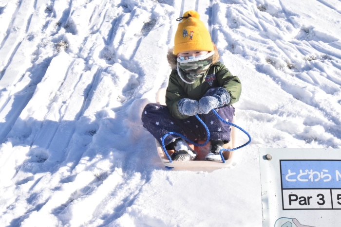 パークゴルフ場で今年初めてのそり遊び。パウダースノーのゲレンデはまだ雪が締まっていないのでふんわりやさしい滑り心地。スノーボードにも挑戦していましたよ。