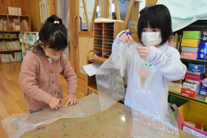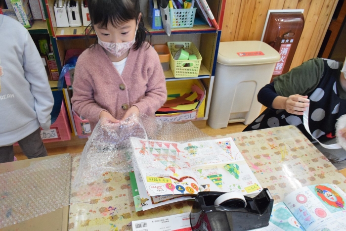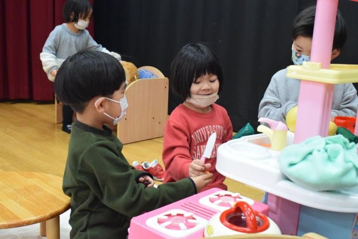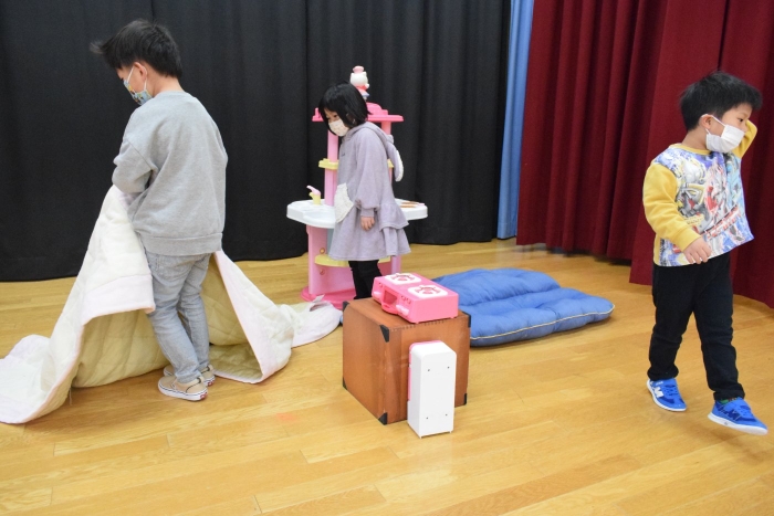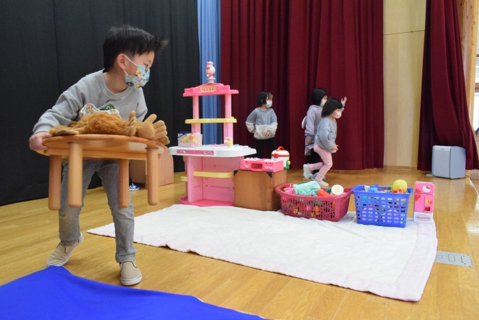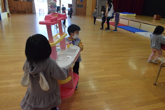 朝の遊びでは、広い家にしたいということでお引越しが始まっていました。今度はどんな家になったのかな?