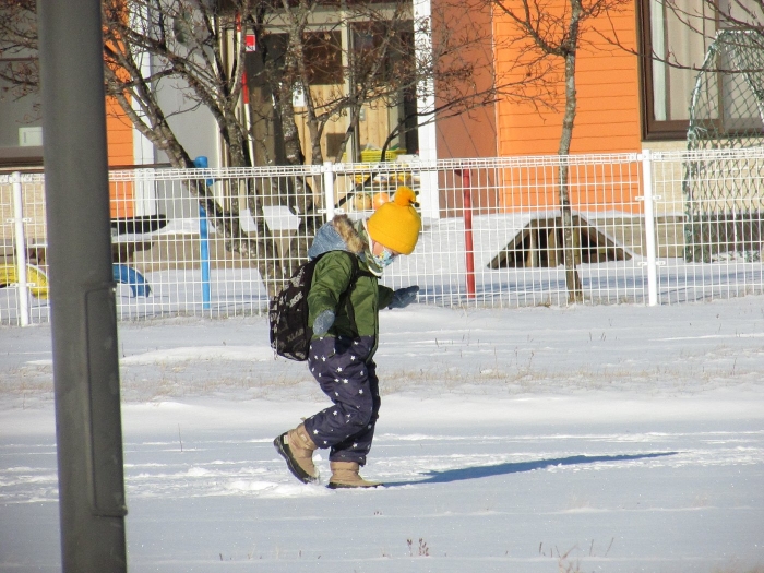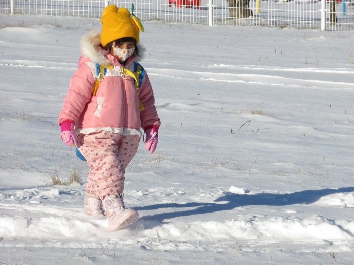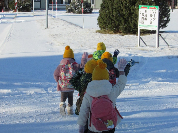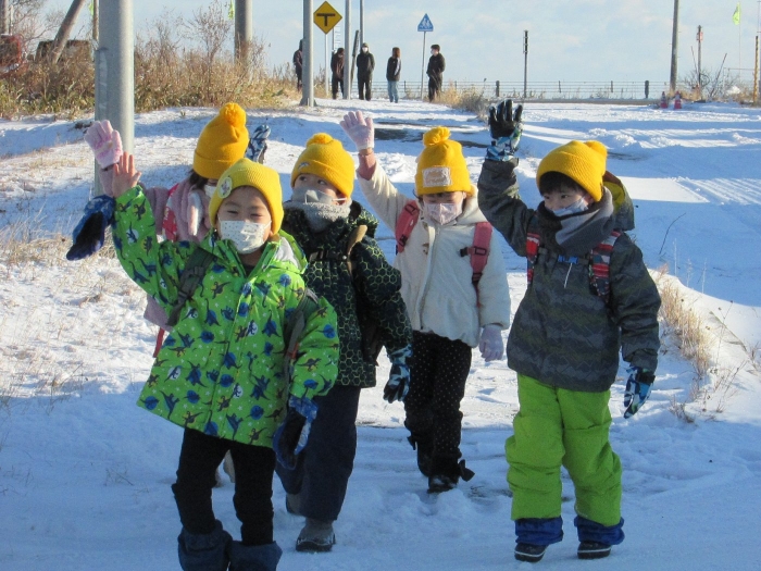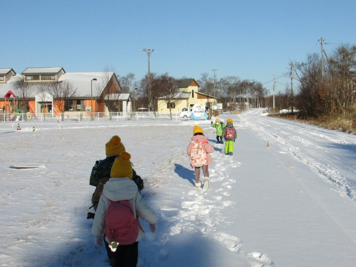 雪道の登園風景、まっさらなキラキラ光る雪の中を足元の雪を踏みしめながら歩いてくる子ども達。雪の感触や音や匂いまで感じているような・・・。