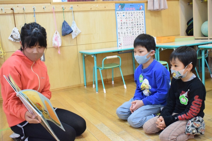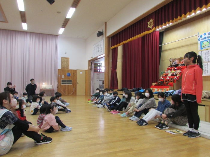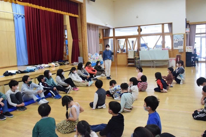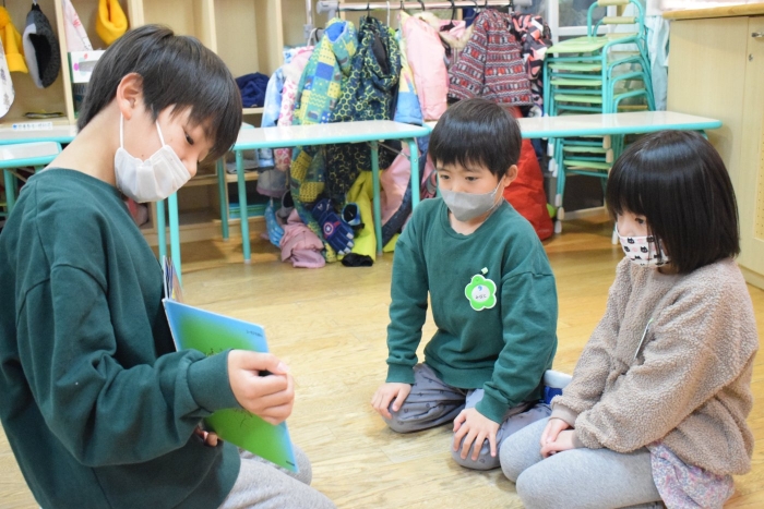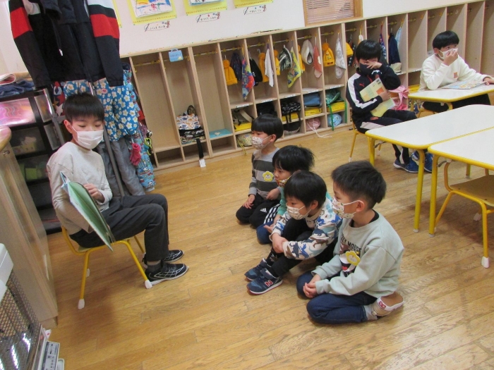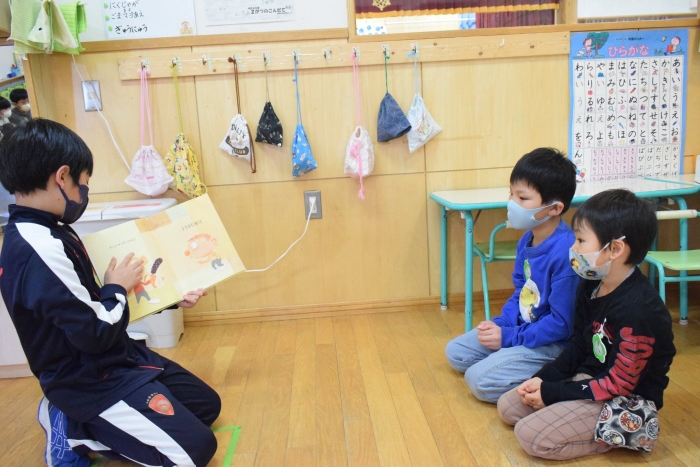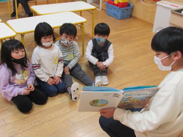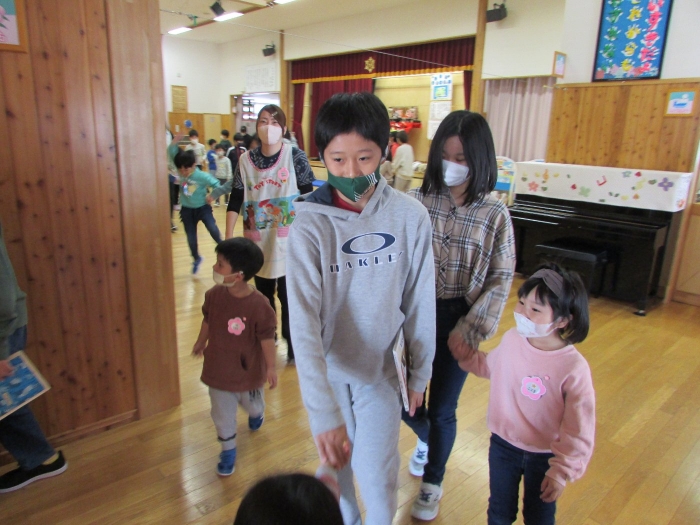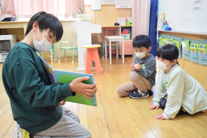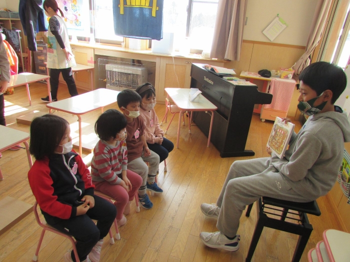 今日は5年生が、園児たちへ読み聞かせをしてあげたいと幼稚園に来てくれました。玄関を入るなり「懐かし~」と5年生。園児の頃には何もかもが大きく見えていたものが今は、机もイスも「小さくてかわいい~」と連発(^^♪ 自分の成長をしみじみ感じた時間だったのではないでしょうか(^^)/ 絵本の読み聞かせは各クラスに分かれて行いました。幼児に分かりやすいように、ゆっくり丁寧に読んでくれている姿が印象的でした。5年生も園児たちも初めはお互い緊張していましたが、名前も覚えたり、呼んでもらったりするうちにだんだんと打ち解けて、最後は子ども達の大好きな『かたき』で遊ぶことができました。5年生は「本気でやってもいいよ」と伝えても、子ども達を気遣って、余裕のある対応をしてくれ、幼稚園チームを勝たせてくれました(^^)/ 給食のときには覚えた5年生の名前を挙げて、「また遊びたいな~」と、さくらさんは1年生になったら会えるのを楽しみにしていました!(^^)!