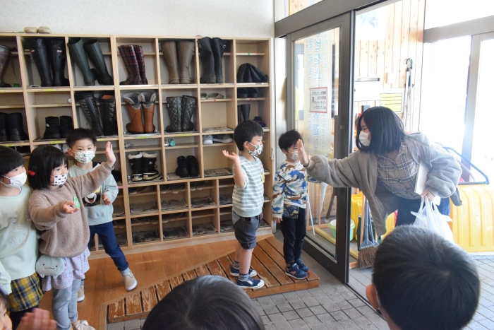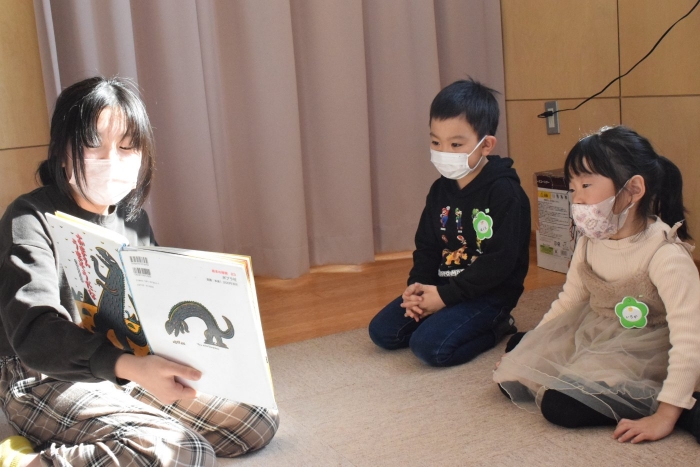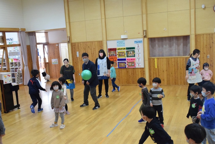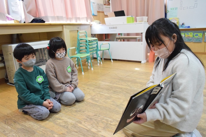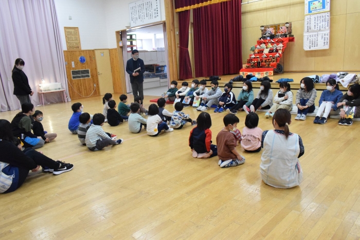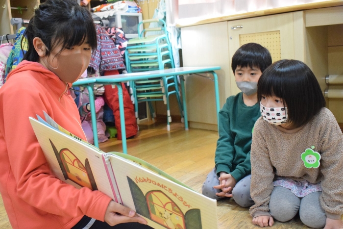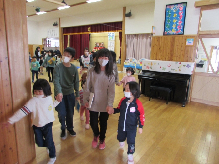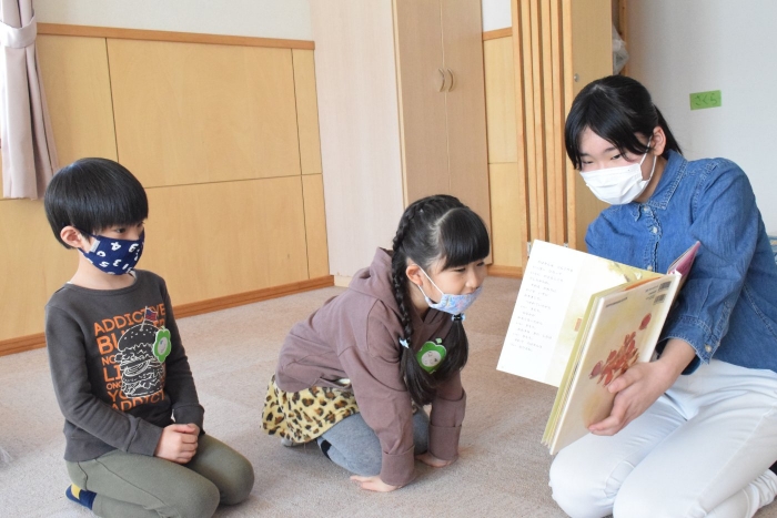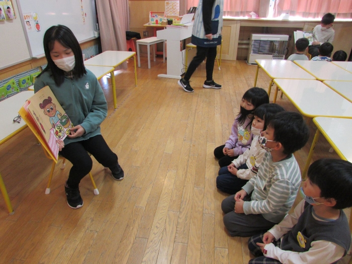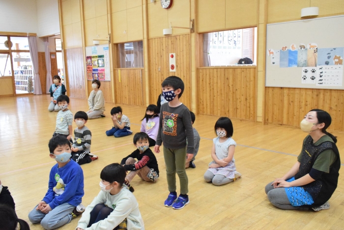 今日は5年生が、園児たちへ読み聞かせをしてあげたいと幼稚園に来てくれました。玄関を入るなり「懐かし~」と5年生。園児の頃には何もかもが大きく見えていたものが今は、机もイスも「小さくてかわいい~」と連発(^^♪ 自分の成長をしみじみ感じた時間だったのではないでしょうか(^^)/ 絵本の読み聞かせは各クラスに分かれて行いました。幼児に分かりやすいように、ゆっくり丁寧に読んでくれている姿が印象的でした。5年生も園児たちも初めはお互い緊張していましたが、名前も覚えたり、呼んでもらったりするうちにだんだんと打ち解けて、最後は子ども達の大好きな『かたき』で遊ぶことができました。5年生は「本気でやってもいいよ」と伝えても、子ども達を気遣って、余裕のある対応をしてくれ、幼稚園チームを勝たせてくれました(^^)/ 給食のときには覚えた5年生の名前を挙げて、「また遊びたいな~」と、さくらさんは1年生になったら会えるのを楽しみにしていました!(^^)!