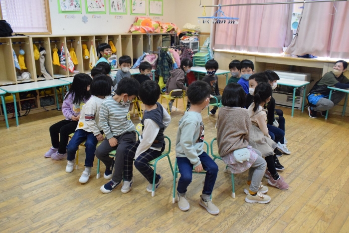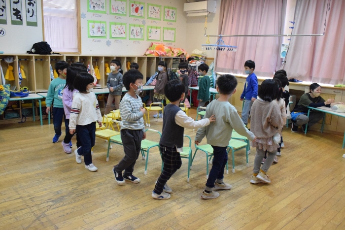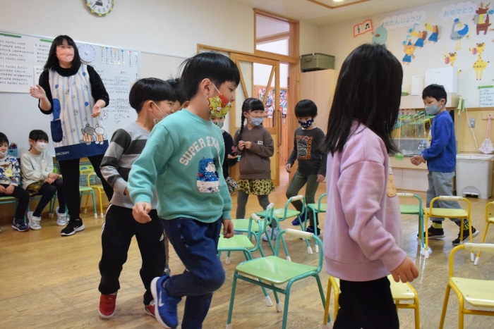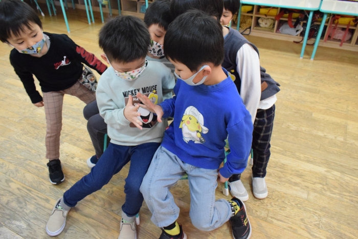 ももさん、さくらさんはイス取りゲームをやっていました。年長さんが勝つとは限らないこのゲーム、イスから目を離さないのが勝利のカギ(^^)/ さあ、今日のチャンピオンは?