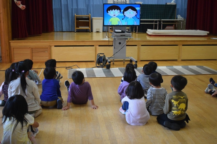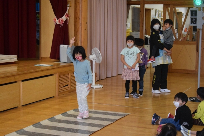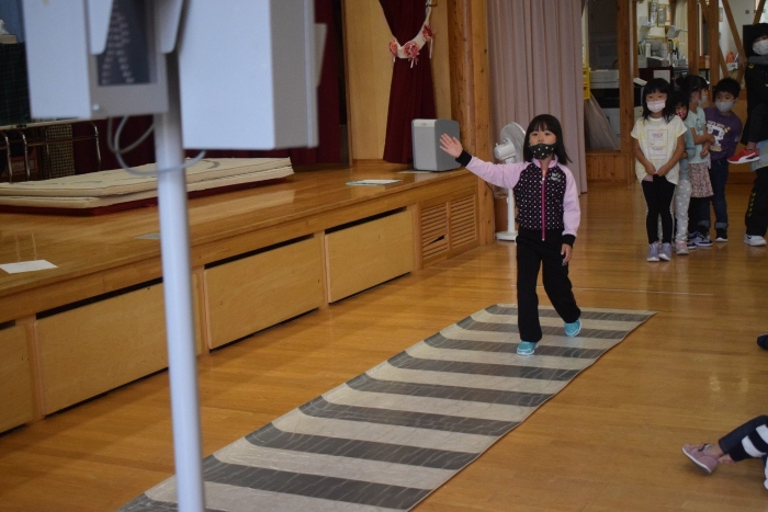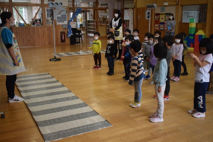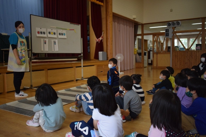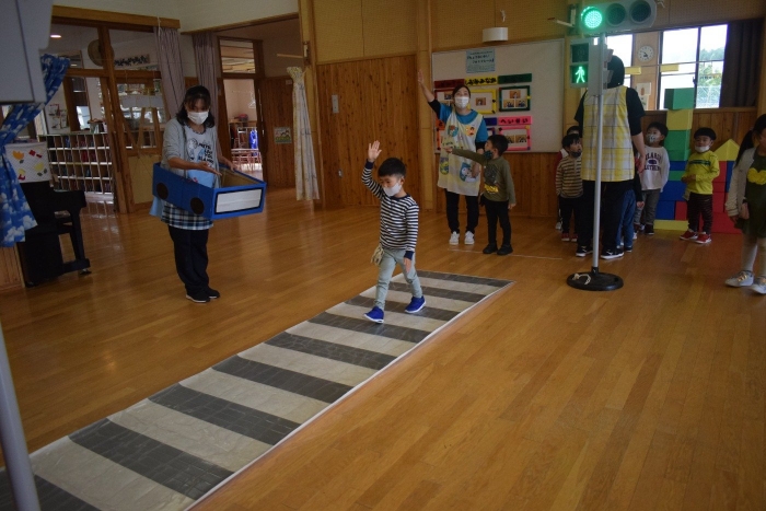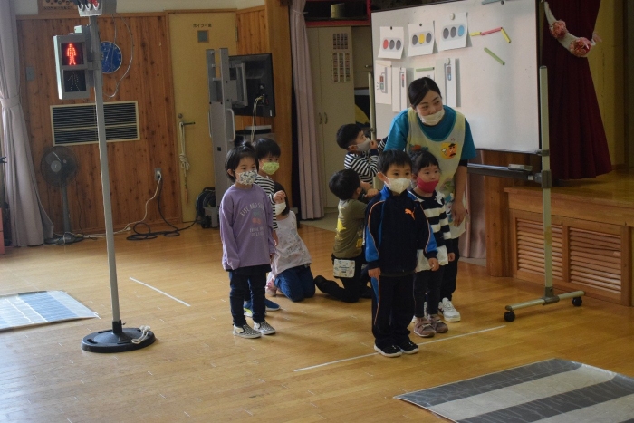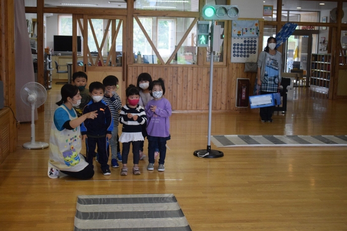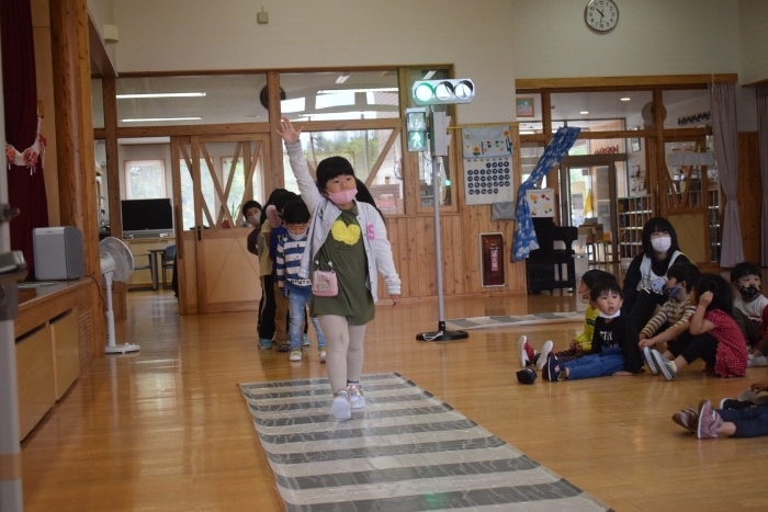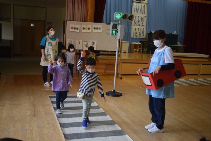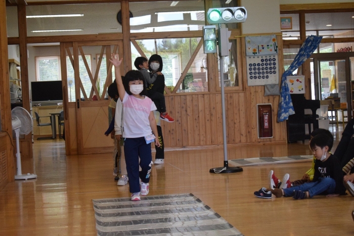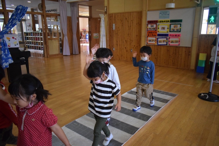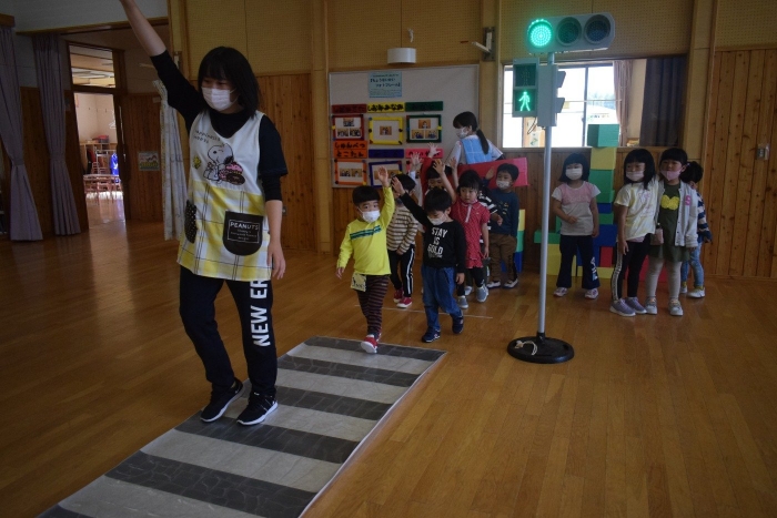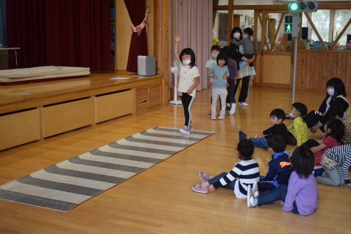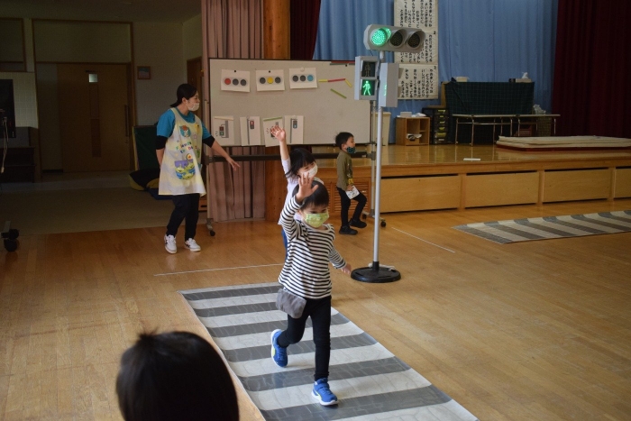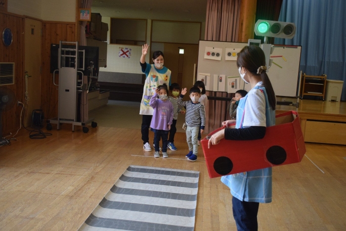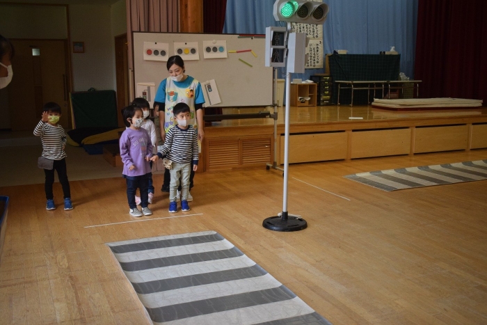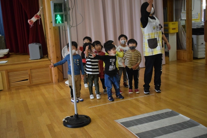 先週の金曜日交通安全教室が開かれました。あいにく雨でグランドが使えず室内での開催となりました。また、コロナ感染防止対策から指導部のお母さん方や警察の方はお呼びできず先生たちで指導を行いました。今回は信号機のみかた、道路の正しい渡り方です。信号機が点滅を始めた時どうするかの練習をしました。さくら組さんが徒歩登園で慣れているのでお手本を見せてもらいその後ほかのクラスも練習しました。野付ではセイコーマートの交差点でお店から出入りする車もいるため、注意が必要ですね。