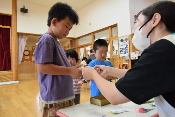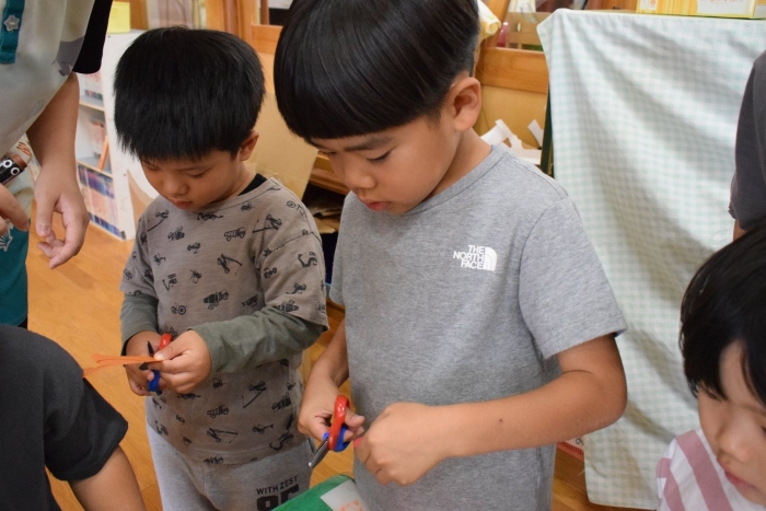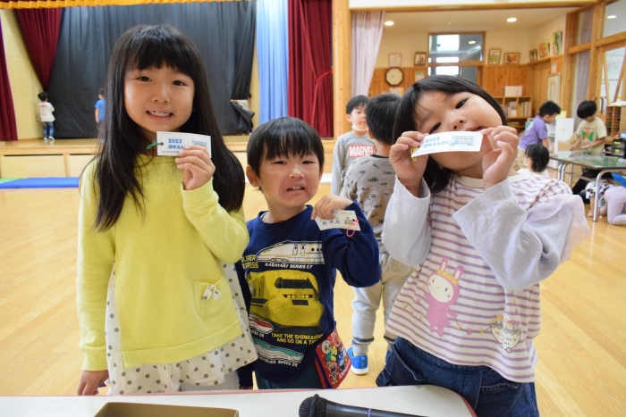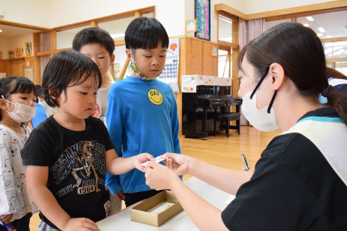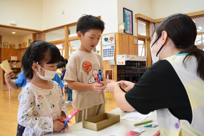 明日はゆめの森公園にバス遠足です。楽しいことがいっぱいあってワクワクが止まらない子どもたち、バスに乗るということで、バス切符を手に入れようとペアのお友だちと協力してバス料金の300円を作って買いに行っていました。ペアのさくらさんは小さい子の面倒をみてあげようと、切りやすいように円を書いてあげたり、字を書いてあげたりしてお世話をしていましたよ。明日はバスにもペアで乗ります。