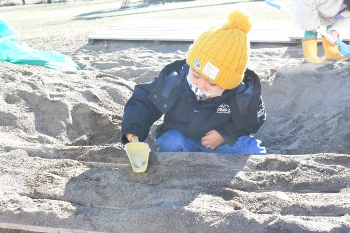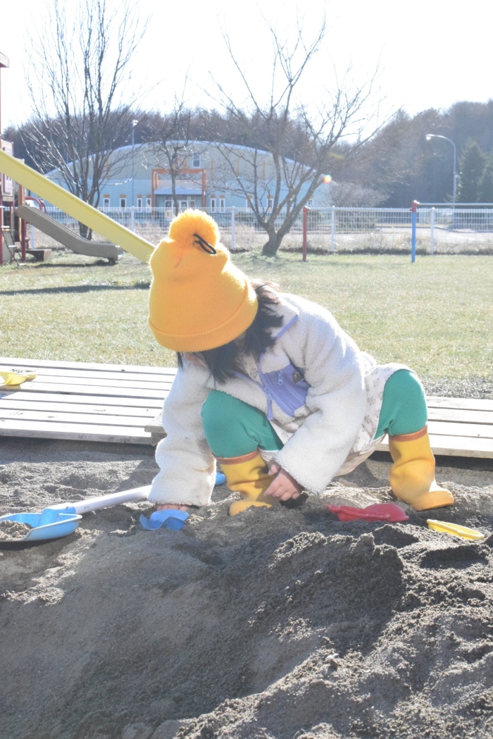 昨日総練習を終え、今日は遊びの時間をたっぷりとりました。うめさんは寒くても外に出たくて、さっさと自分で身支度をして「いってきま~す!」と飛び出して行きました(^^)/ プラスチックのスコップで砂を掘ってみたら固くて掘れない(>_<) 「剣先スコップください!」と要求していたうめさんでした。たくましいですね~。