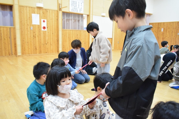 ひとり一人に言葉を添えて手渡ししてくれて、自分たちのことを思って作ってくれたことに子どもたちも感謝の気持ちで受け取っていました。1年生パワーでお遊戯会、頑張れそうですね!素敵なプレゼント、ありがとうございました。