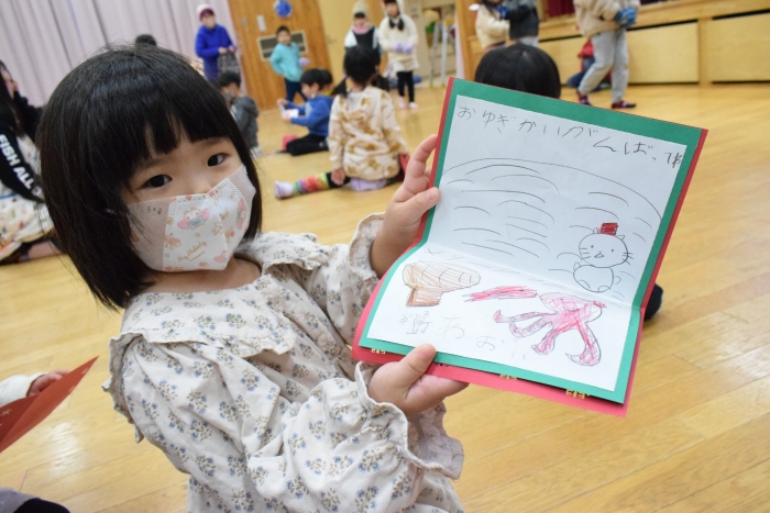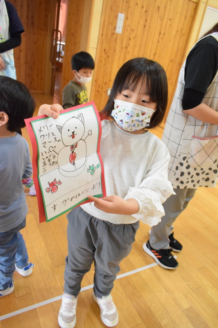 小学校1年生がクリスマスカードを作ってプレゼントしにきてくれました。「げんきですか?」や「おゆうぎかいがんばってね!」のメッセージと自分たちで育てたアサガオの種付きでした!(^^)! なんと嬉しいサプライズでしょう(^^)/ありがたいですね。