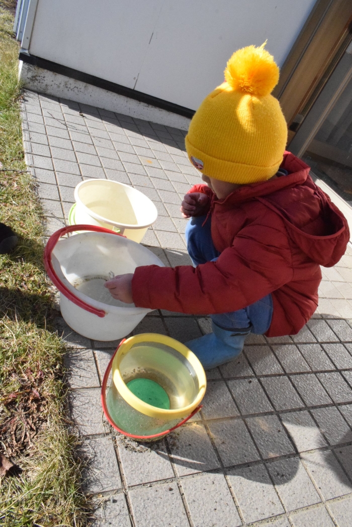 バケツの水が凍ってなかったので、小さな氷を見つけてバケツに入れてました。