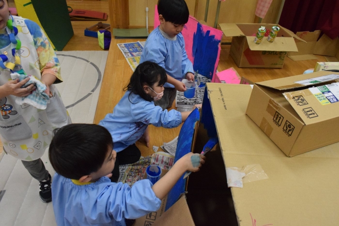 朝来るとさっそく昨日の続きのペンキ塗りが始まっていました。今日は昨日予定していた青で塗っていましたよ!どんな家になるのでしょうか、楽しみです。