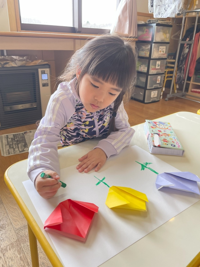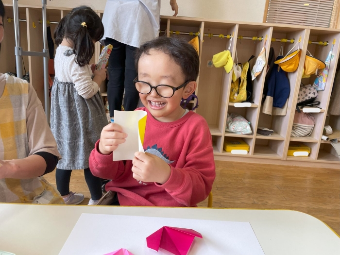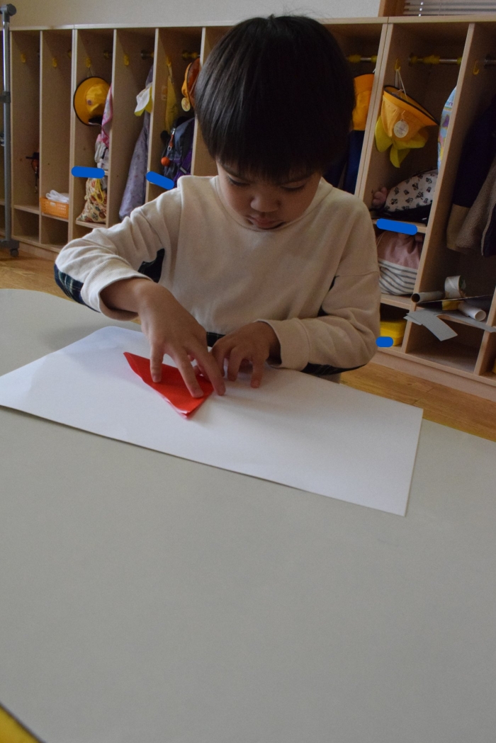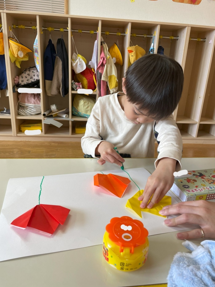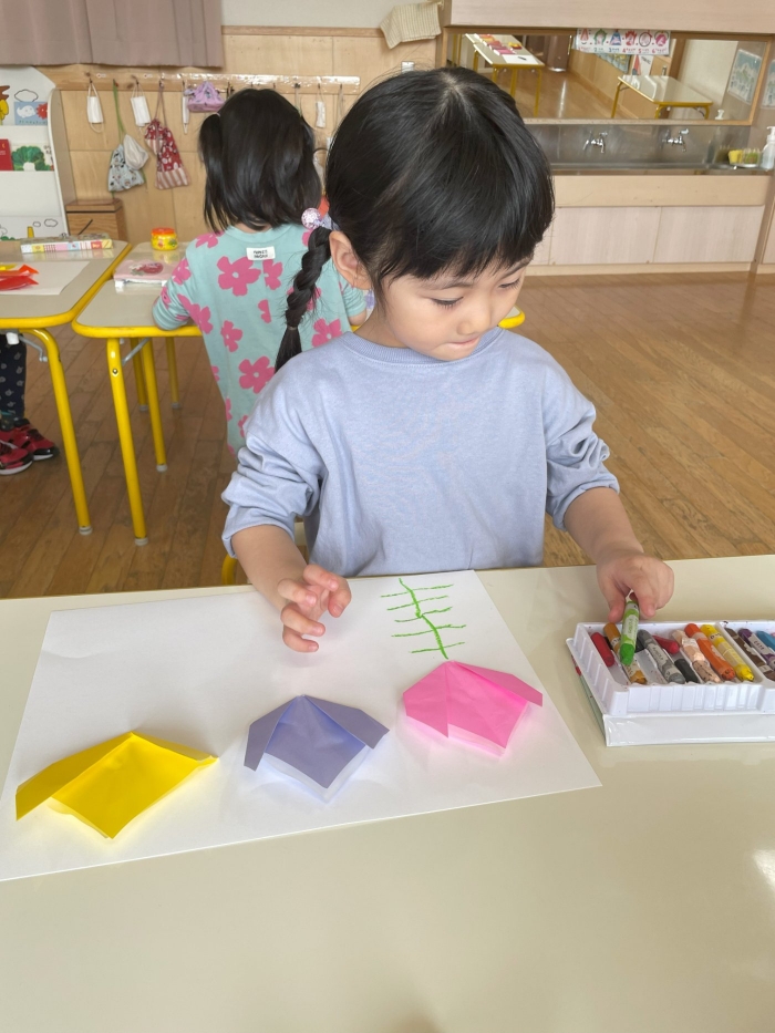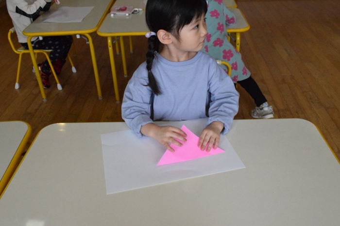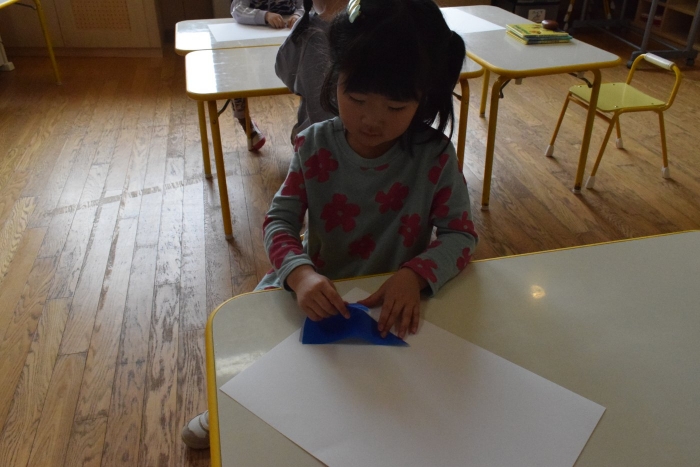 そのあとは製作遊びが始まりました。。今日はちゅーりっぷの折り紙のようです。先生の説明をよく聞いて,折り紙の端っこをきちんと合わせて,折り目をピシッとつけて…。折り紙を折る中でも,いろいろな大事なポイントがありますね。