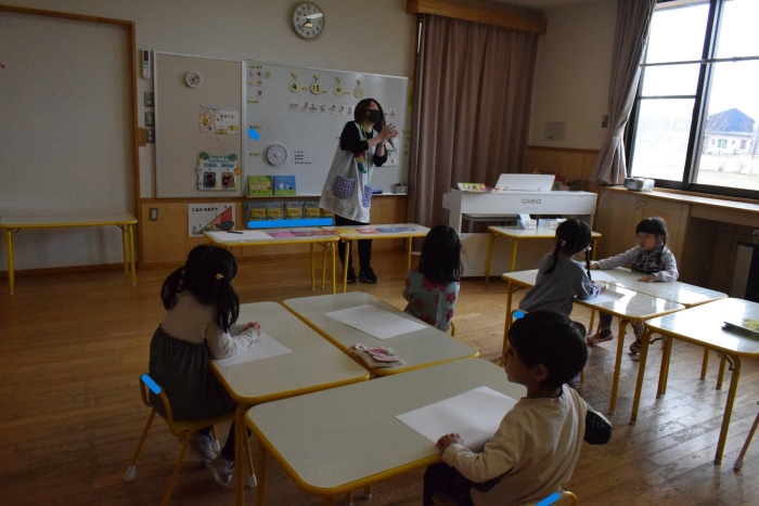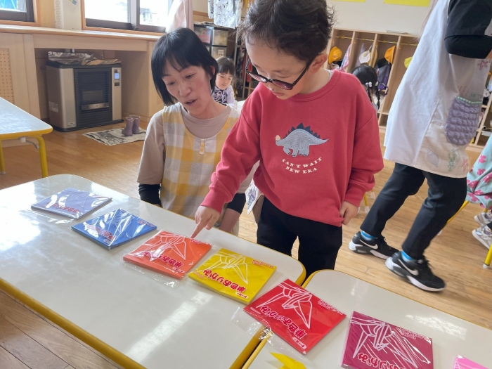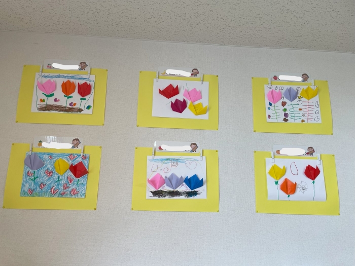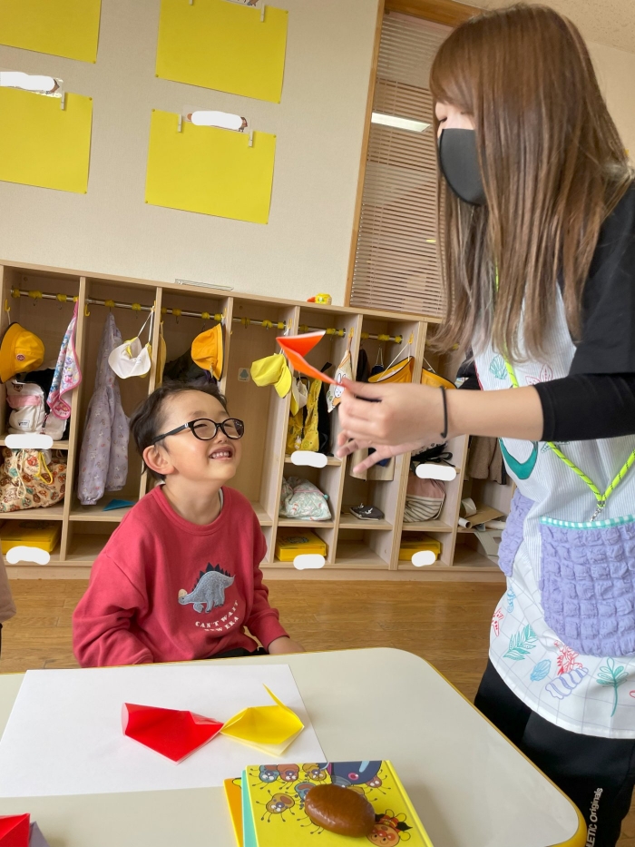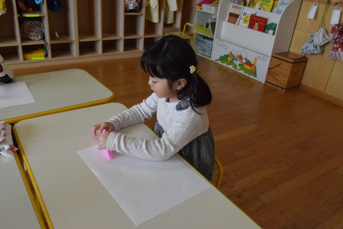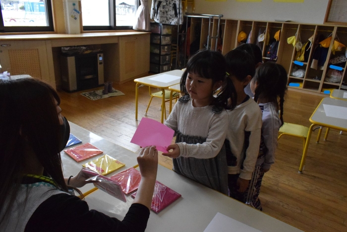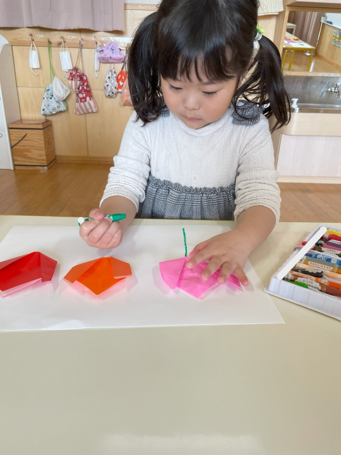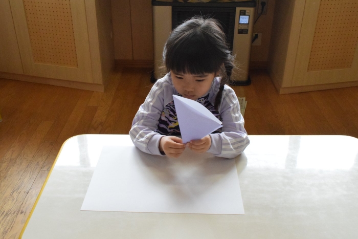 そのあとは製作遊びが始まりました。。今日はちゅーりっぷの折り紙のようです。先生の説明をよく聞いて,折り紙の端っこをきちんと合わせて,折り目をピシッとつけて…。折り紙を折る中でも,いろいろな大事なポイントがありますね。