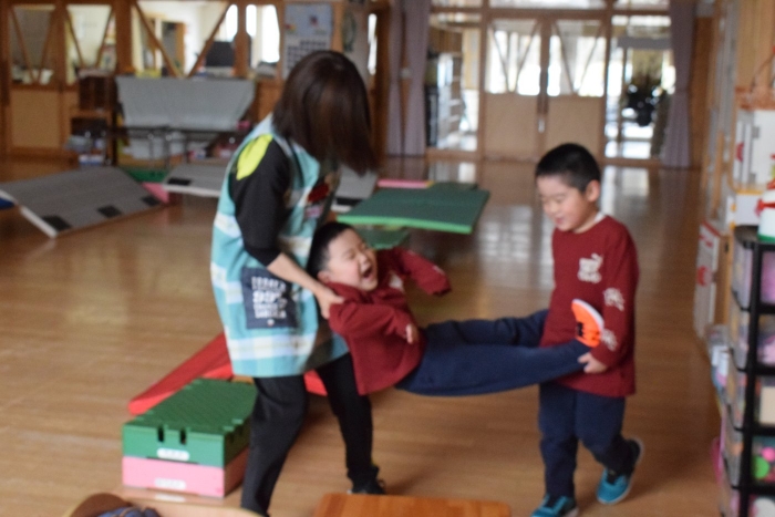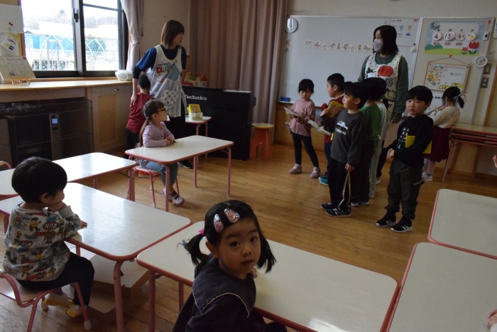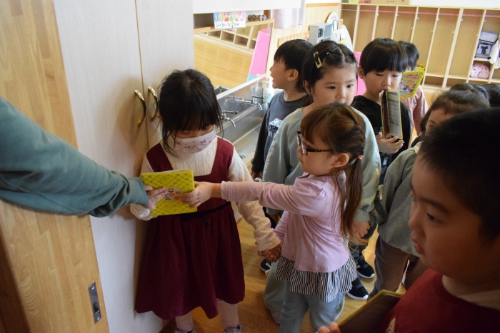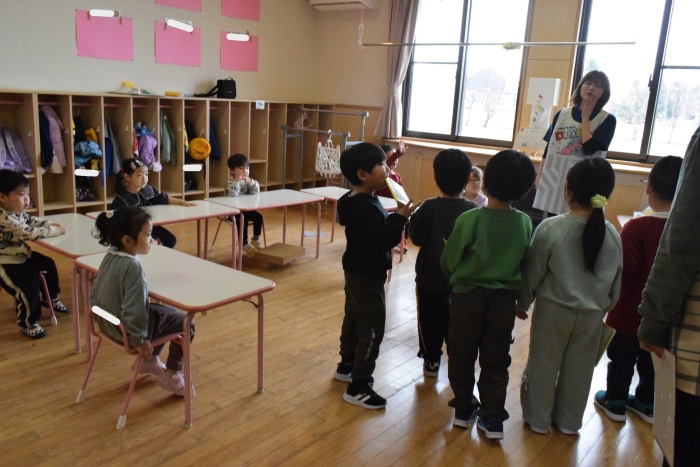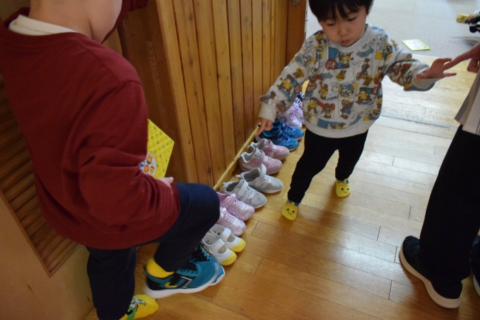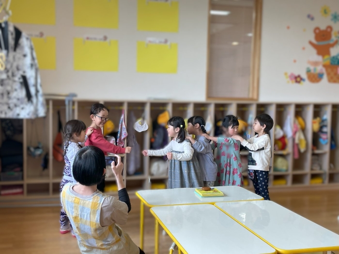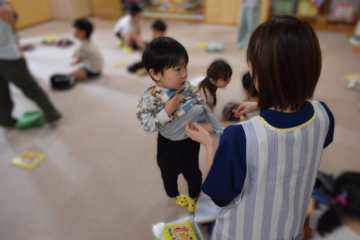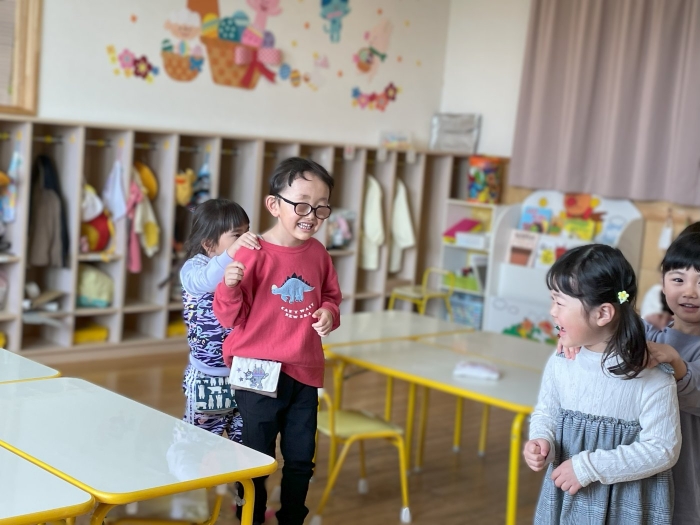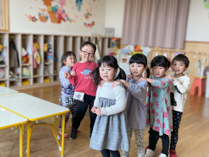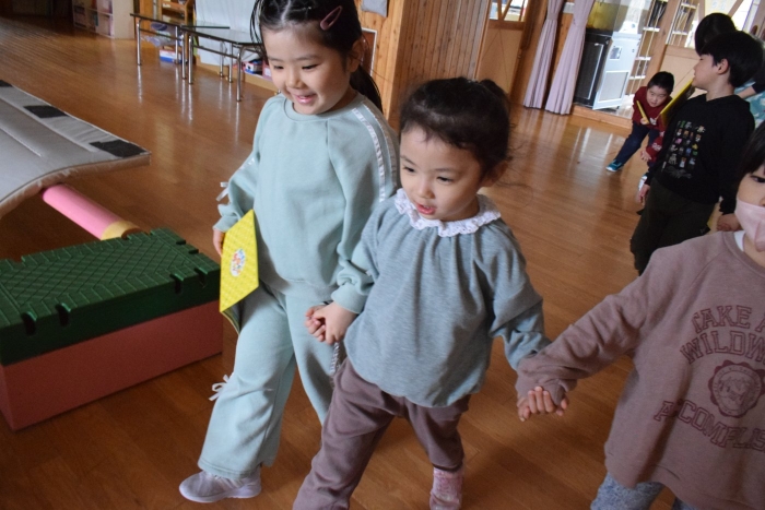 もも組さんのお部屋ではじゃんけん列車をしていました。ピアノの音楽に合わせて,出会ったお友達とじゃんけんポン!負けたらお友達の後ろにつながって…を繰り返します。チャンピオンは誰かな?ぐーちょきぱーで指を動かすことも指の力,お箸をもつ力,鉛筆を持つ力につながるので,こうして楽しみながら訓練できると良いなと思います。