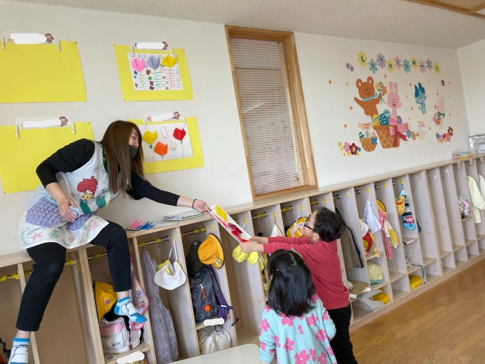 初めて身体測定をするうめ組さんのために,さくら組さんが教えてくれていましたよ。