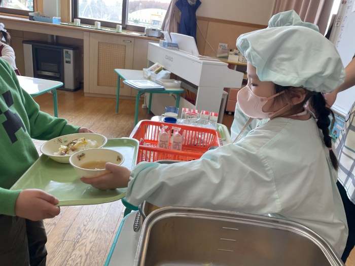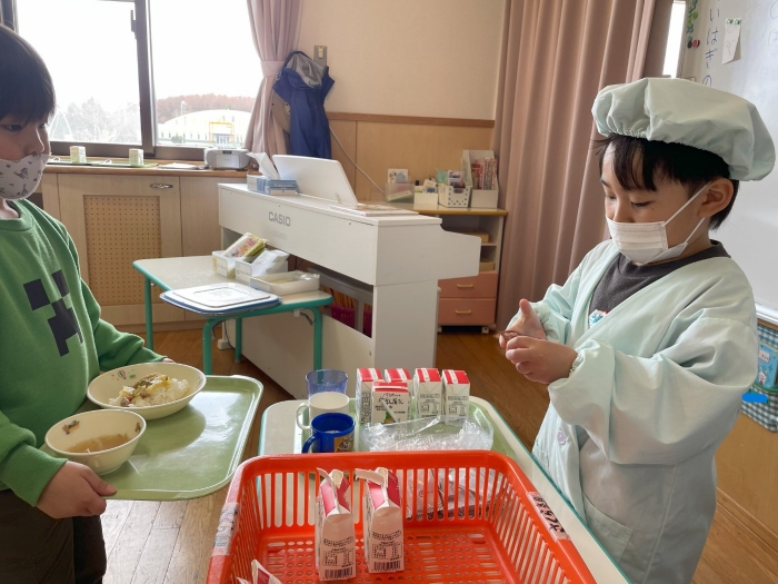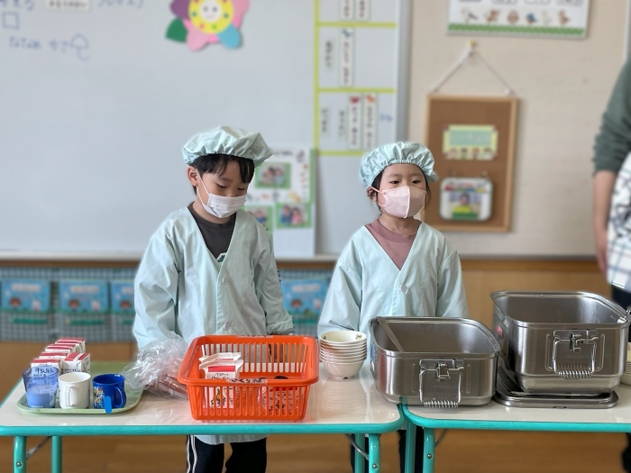 さくら組さんの今日の給食お当番の様子。お当番のご挨拶や,盛り付けの方も頑張っていますよ。お当番の順番が回ってくるのが楽しみの様子です。