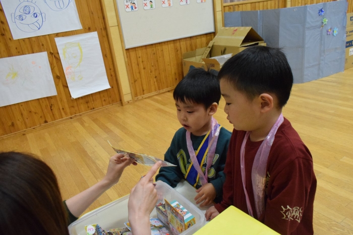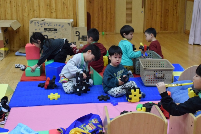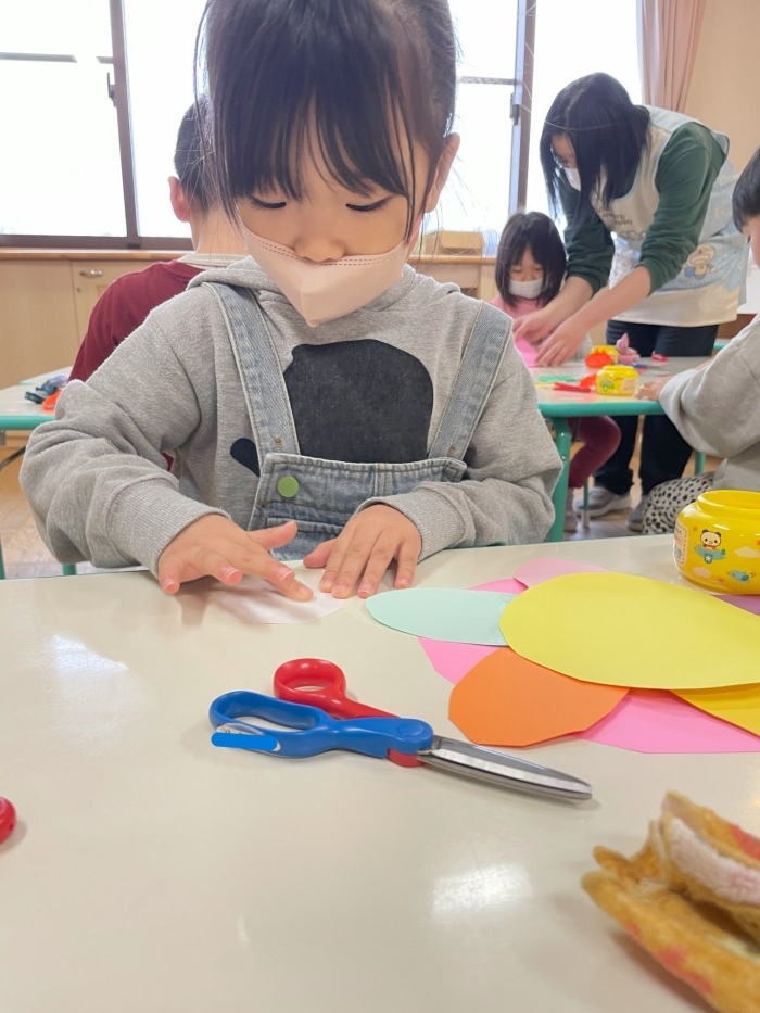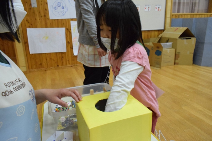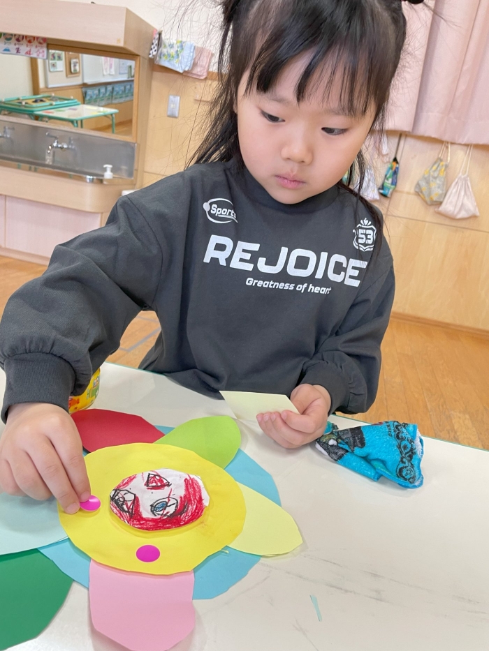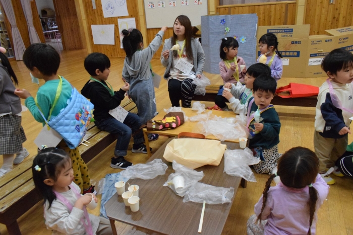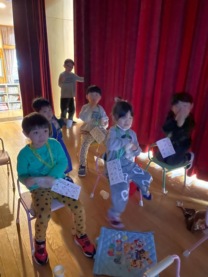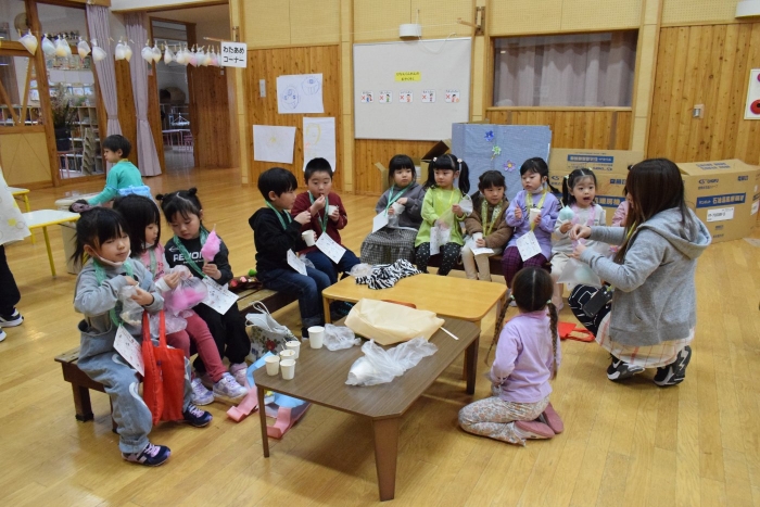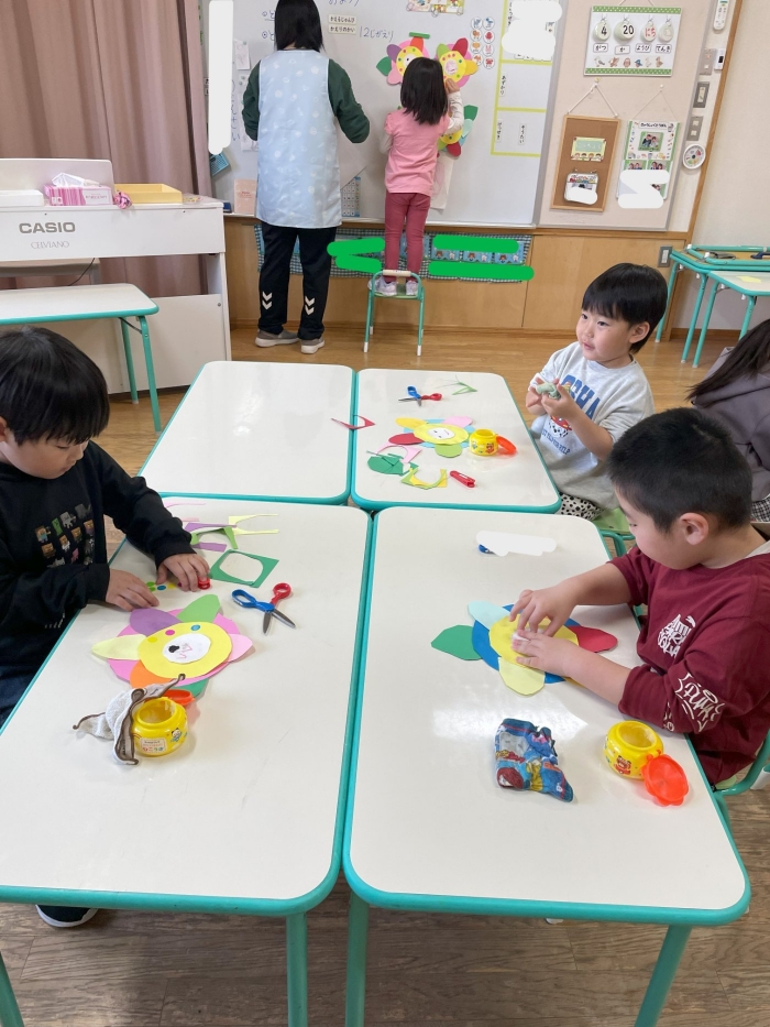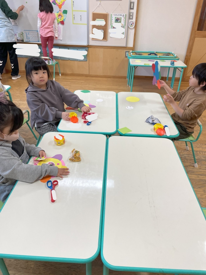 先生たちは,お祭りの準備をせっせと行っている間,みんなには遊んで待っていてもらっていました。さくら組さんはお部屋で何やら製作中…