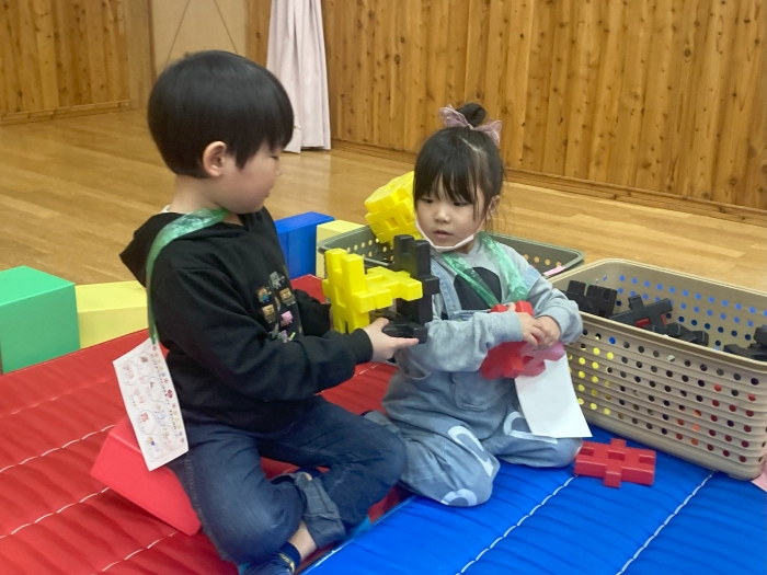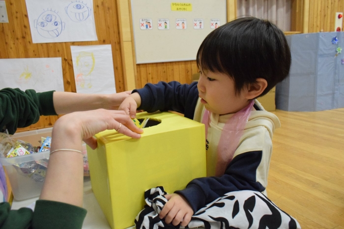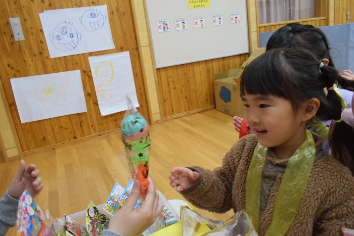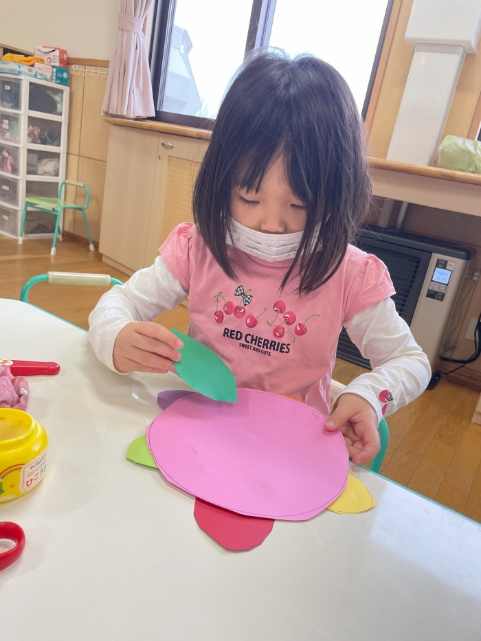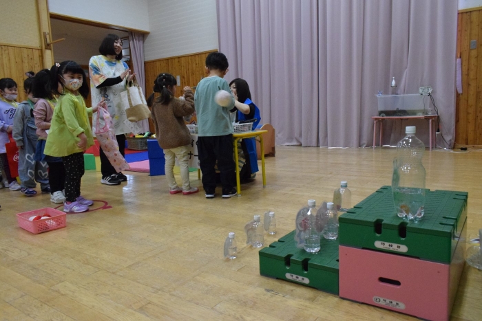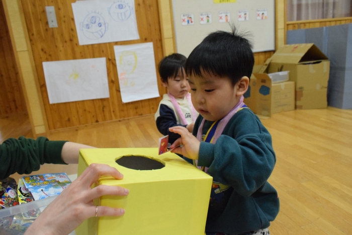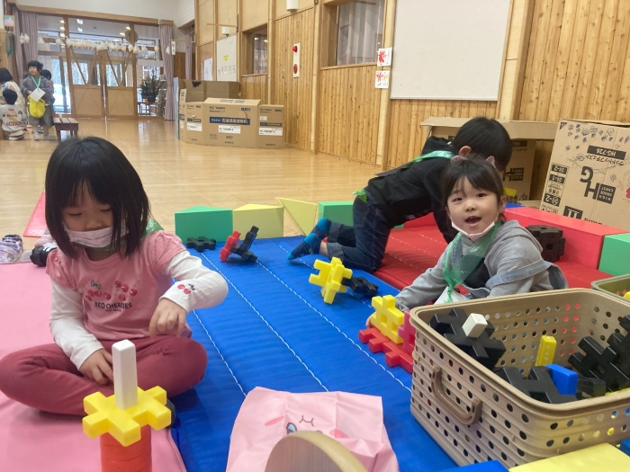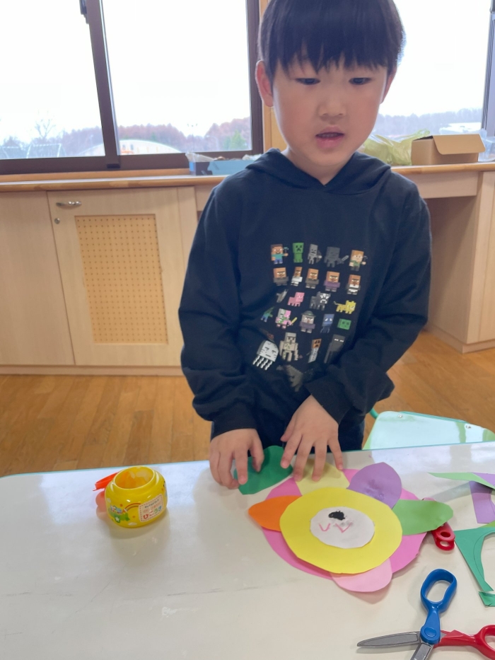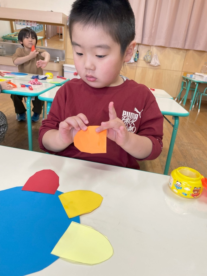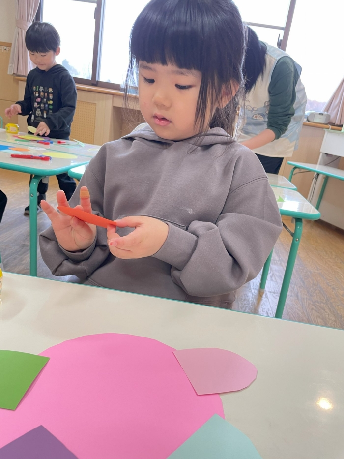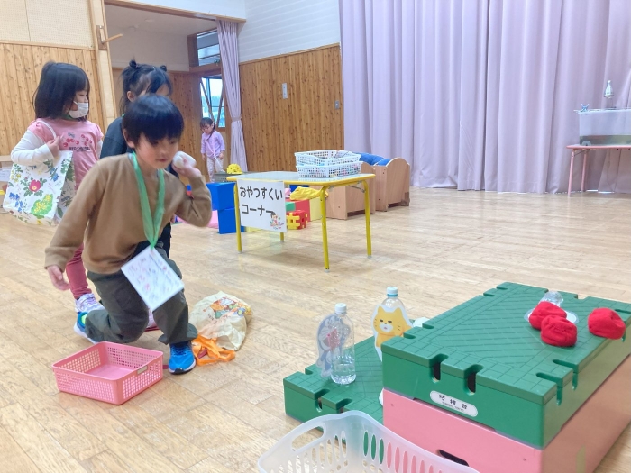 先生たちは,お祭りの準備をせっせと行っている間,みんなには遊んで待っていてもらっていました。さくら組さんはお部屋で何やら製作中…