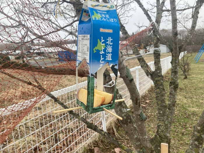 昨日のお休みの日に,お友達が鳥のエサ箱に,リンゴを入れておいたそうで,登園してさっそくエサ箱をのぞいていましたよ。