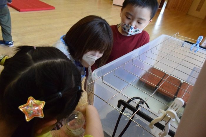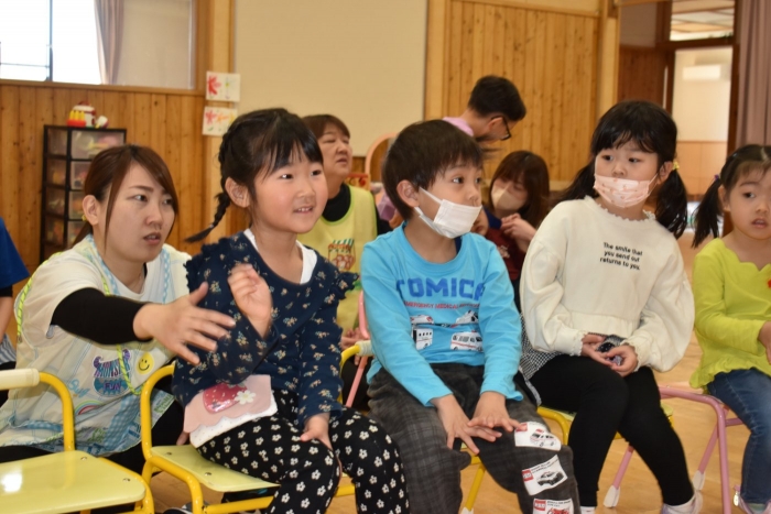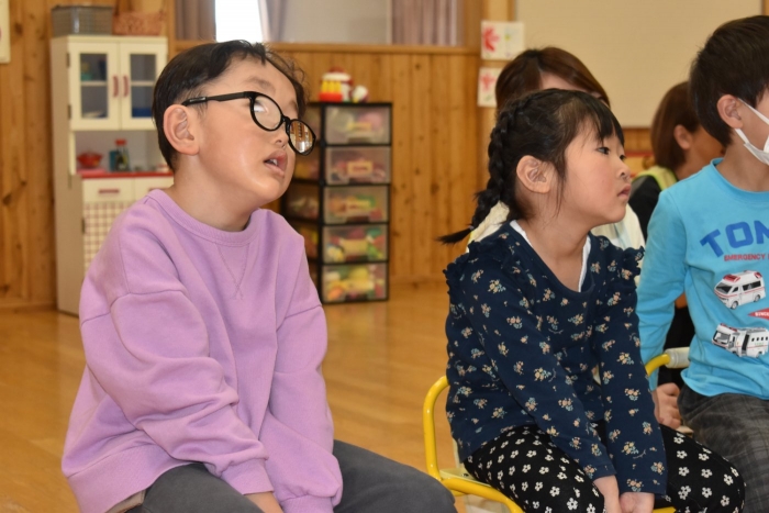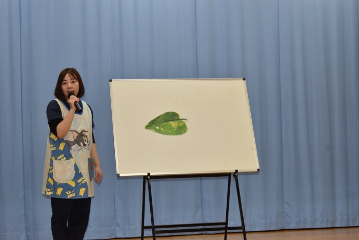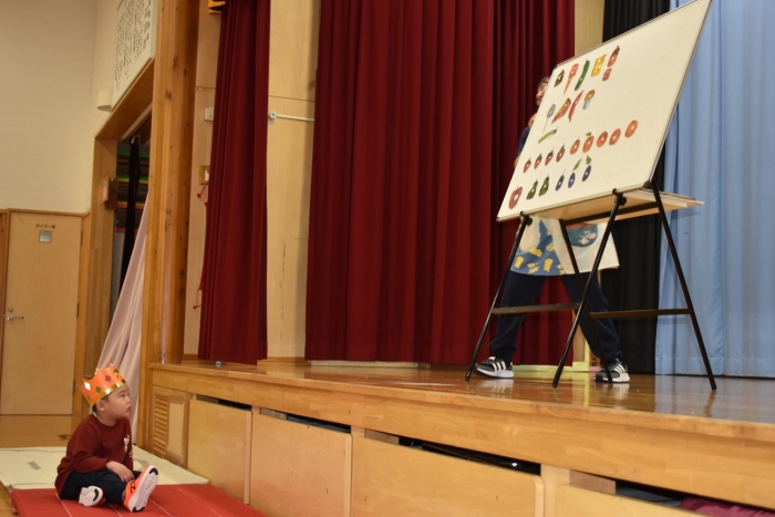今日のお誕生会のお楽しみは『はらぺこあおむし』のパネルシアターです。一昨年のお遊戯会で,今のさくら組さんが,うめ組時代に劇遊びで『はらぺこあおむし』を行ったため,親しみのあるお話のようです。さくら組さんが一緒に歌も歌ってくれていましたよ。