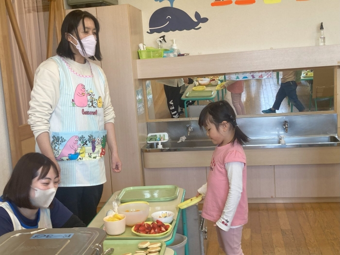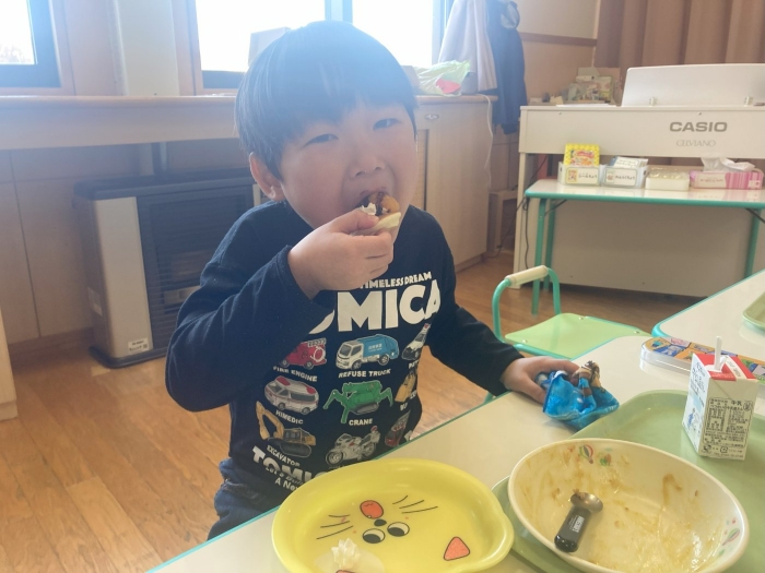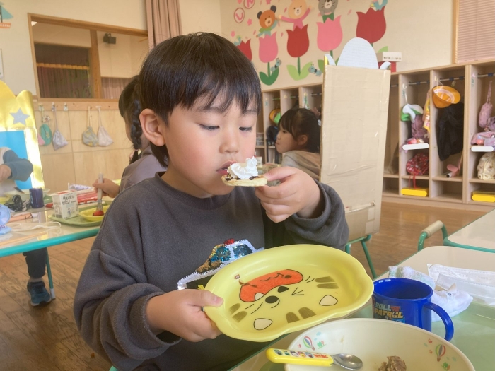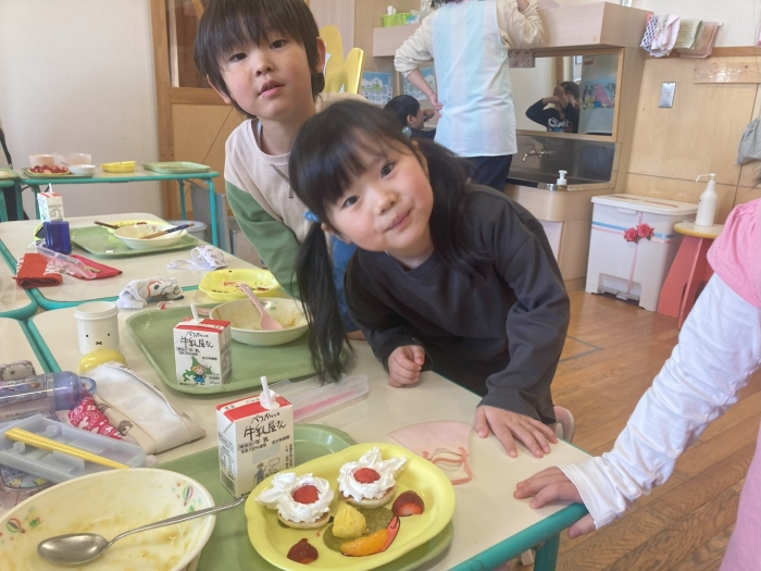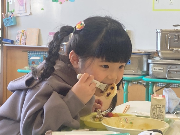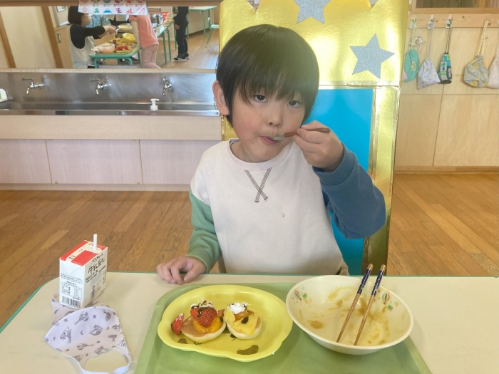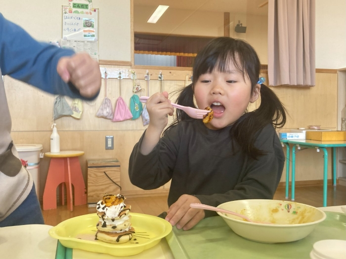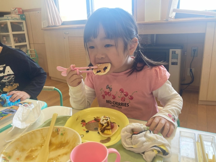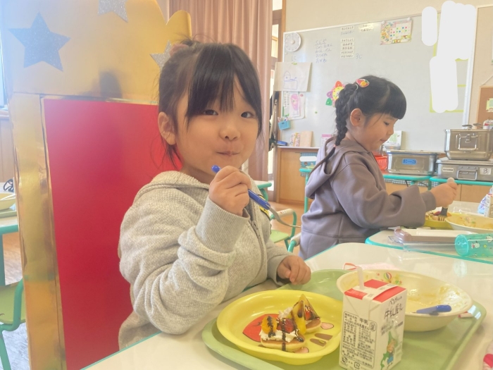 お誕生会の日は,給食の時にデザートが出ますよ。今日のデザートはパンケーキ。さくら組さんの様子をご紹介。