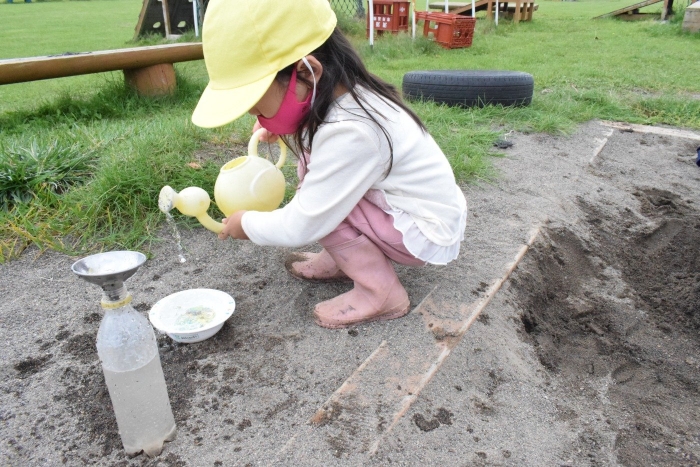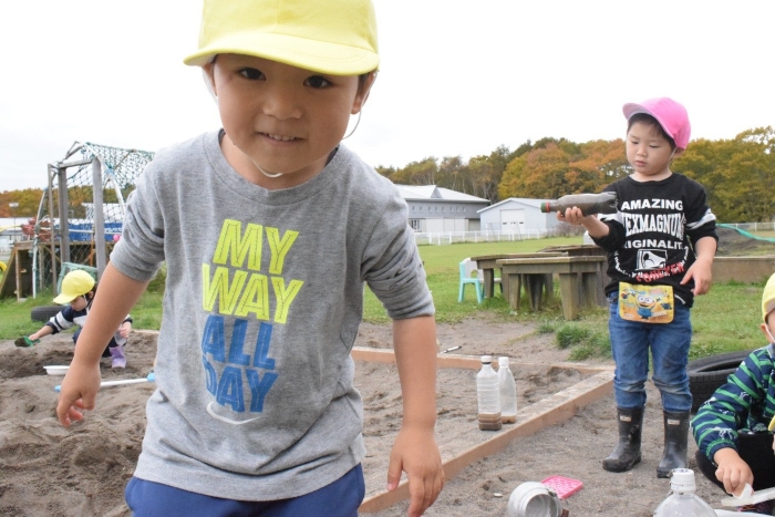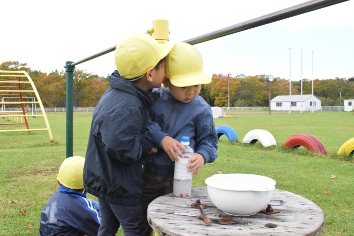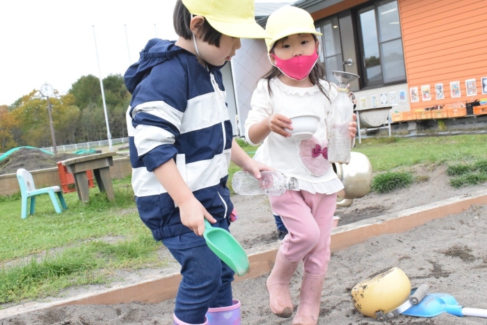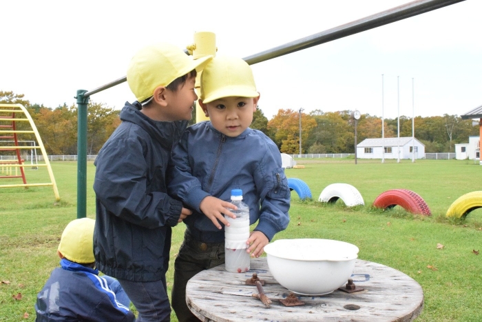 うめ組もも組の遊び風景 2021年10月14日(木) 今日のうめ、もも各クラスの様子を写真でご紹介します。 ほんわか~ 久しぶりのブランコだね 滑り台も楽しいよ ほんとブランコ久しぶり! やっぱ砂遊びの方がいいわ 何か探しにいくんだってさ ほんわか~ カタツムリ探しにきたんだけど いないなあ~ 葉っぱの下探してもいなかったね 落葉拾おうか 生クリームを作っています よくホイップして お水くんでこよっと 私もじょうろでお料理つくり あのさ、そんでさ~ お~! それいいなあ! カタツムリいなかったね ざんねん またこんどこようね