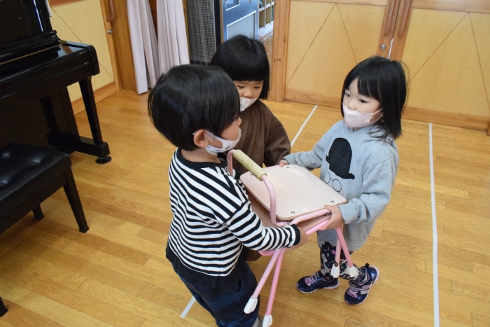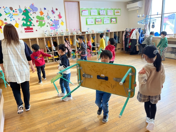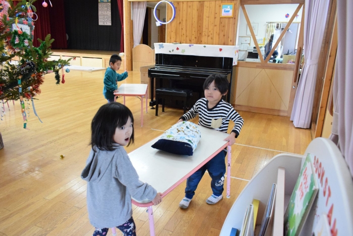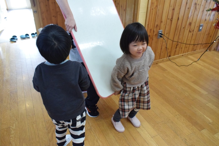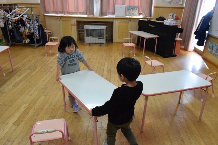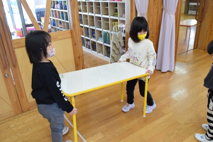 うめさん、協力して机を運びます。
