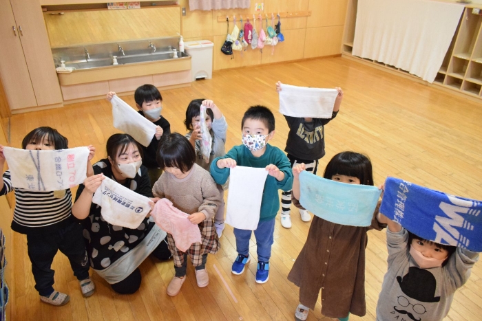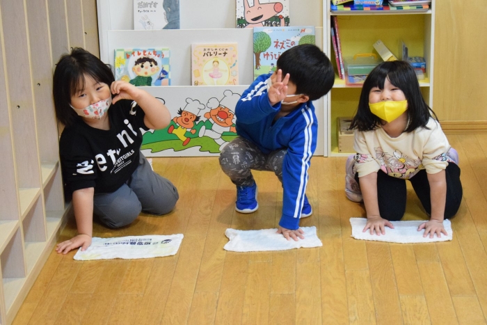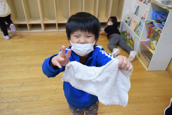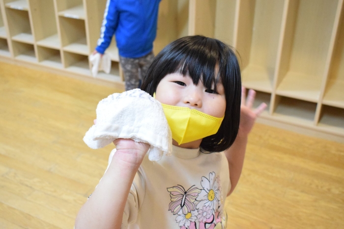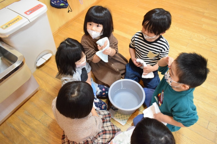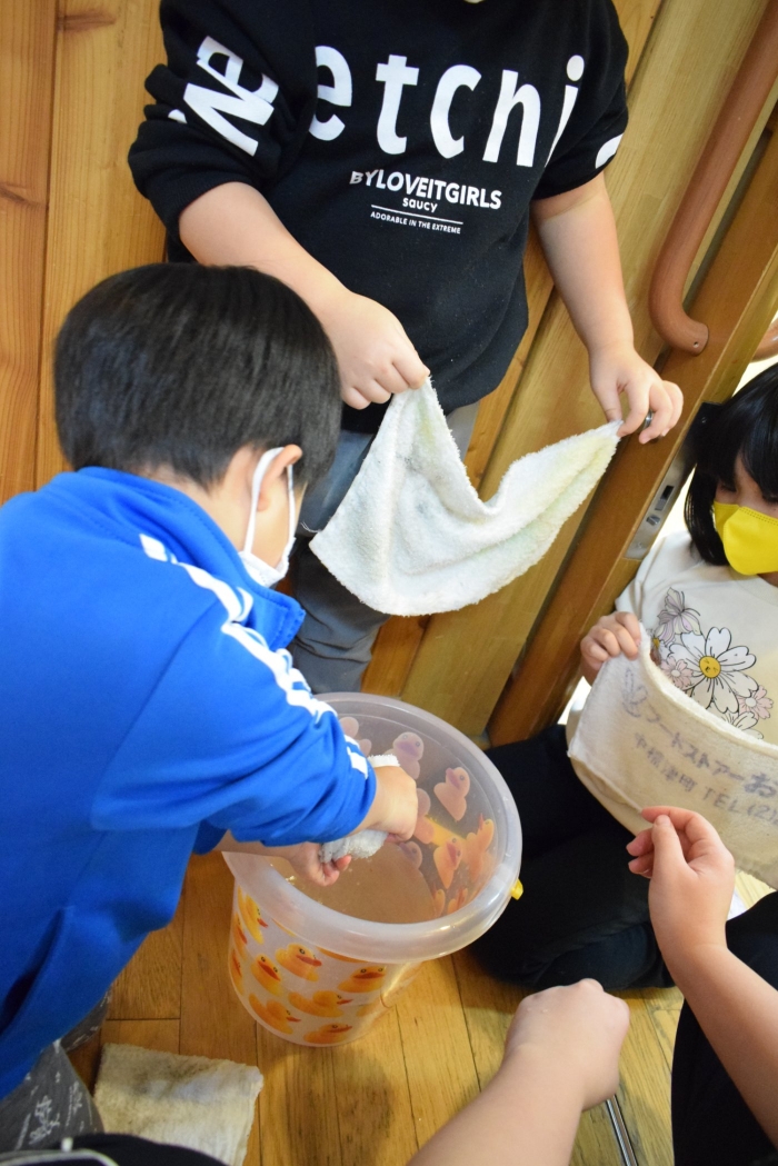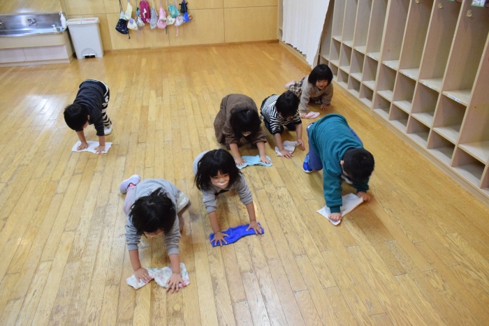まず初めにお部屋の中のものを出して空っぽにします。机もイスも、自分のロッカーの中身も! 広~くなったお部屋を、さくらさんはほうきで掃くことから始めます。うめさん、ももさんは雑巾で拭き掃除からスタート。床やロッカーの中はもちろん、汚れていそうなところを自分で気が付いて自主的に拭いている子もいましたよ。さくらさんは毎日のお掃除ですっかり慣れて手際よく掃いたり、拭いたりとせっせと働いていました(^^)/ すっかりきれいになったお部屋で、給食もこぼさないように気を付けて食べていた子どもたちでした。気分もスッキリ!いっぱい働いたご褒美におやつももらってニッコリ!
