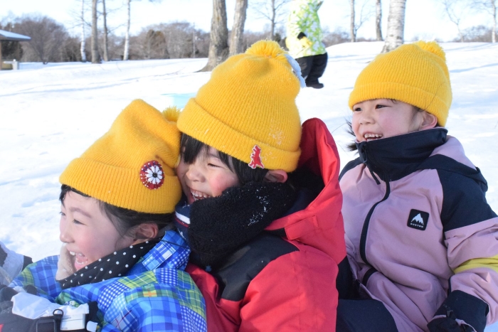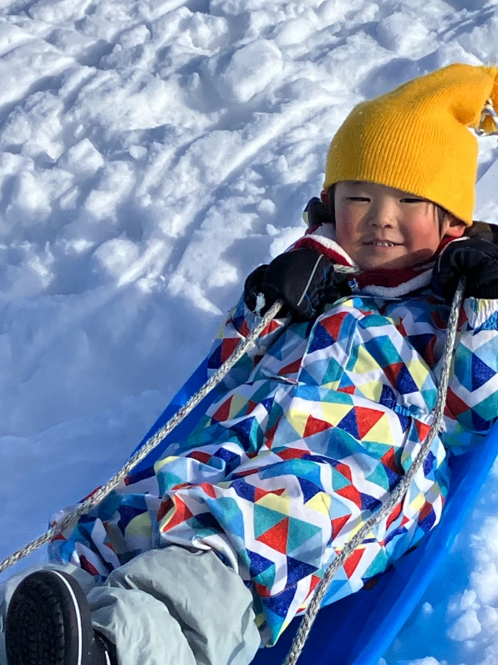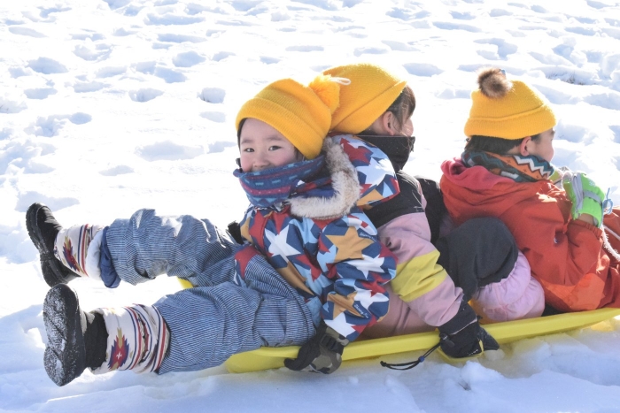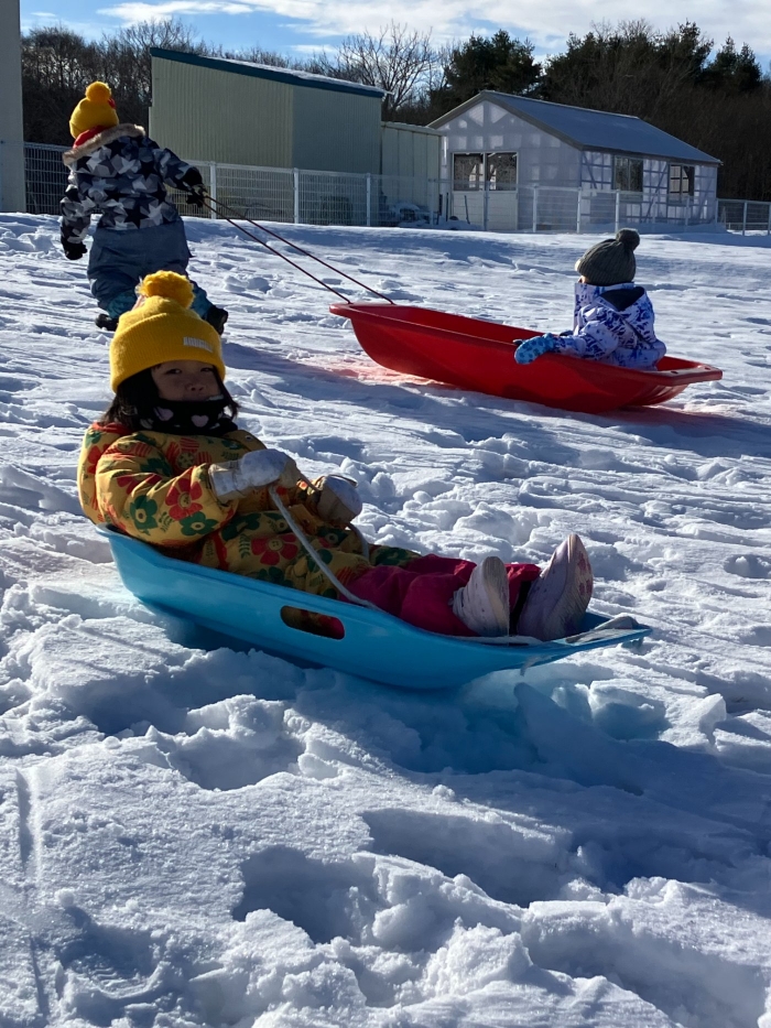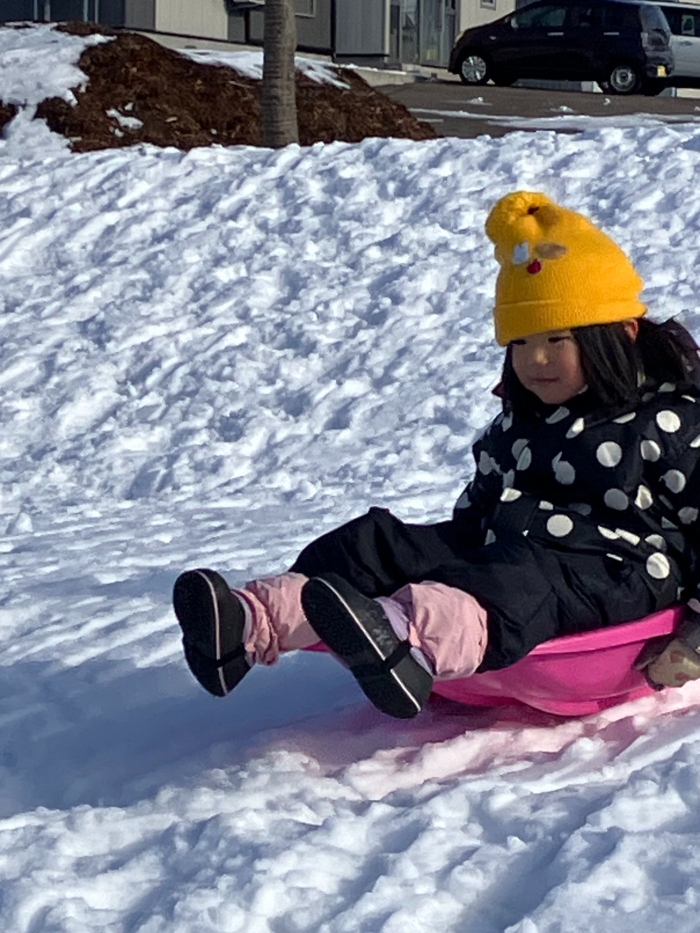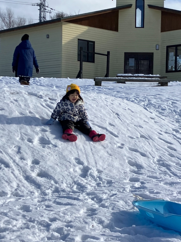 午後からさくらさんもパークゴルフ場のゲレンデへそり滑りに行きました。昨日よりスピード感が増して面白さ倍増!もっと長く滑れる場所も見つけ、大型ソリにみんなで乗り込みワーワーキャーキャー言いながら何回も滑り込んでいました。