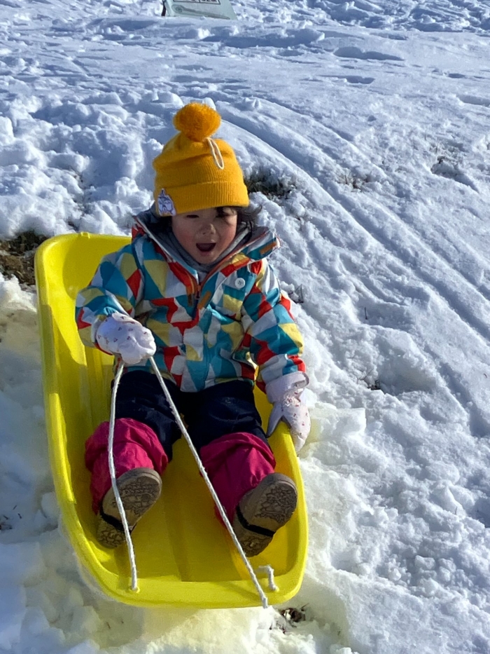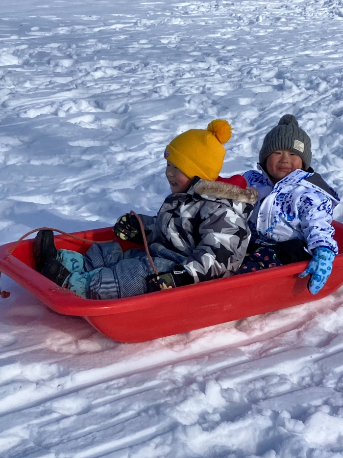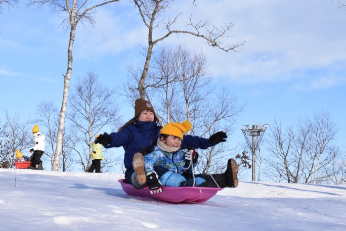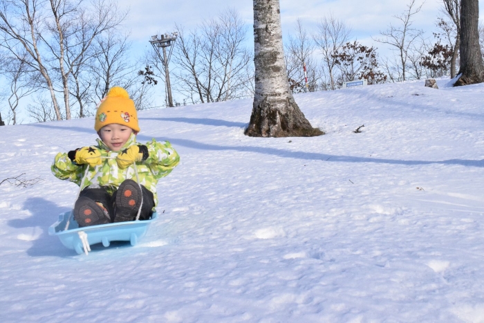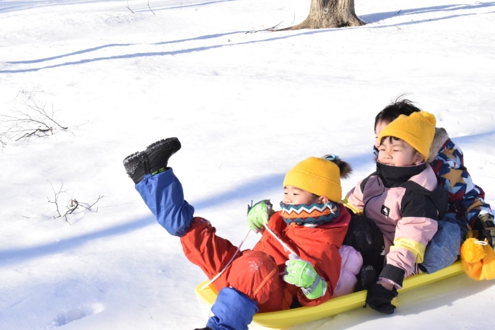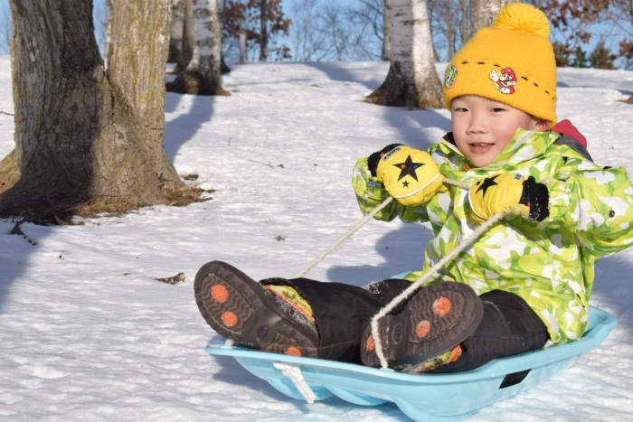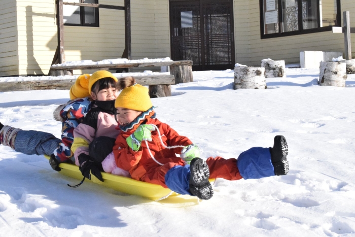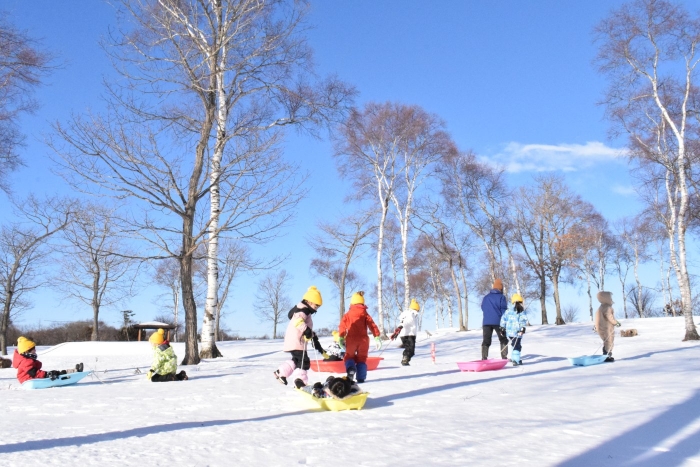 午後からさくらさんもパークゴルフ場のゲレンデへそり滑りに行きました。昨日よりスピード感が増して面白さ倍増!もっと長く滑れる場所も見つけ、大型ソリにみんなで乗り込みワーワーキャーキャー言いながら何回も滑り込んでいました。