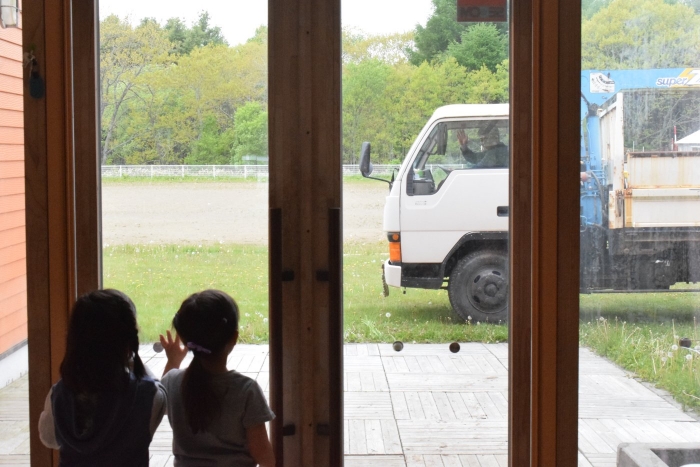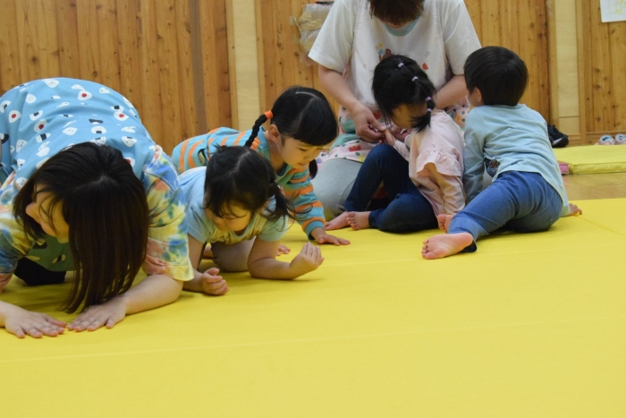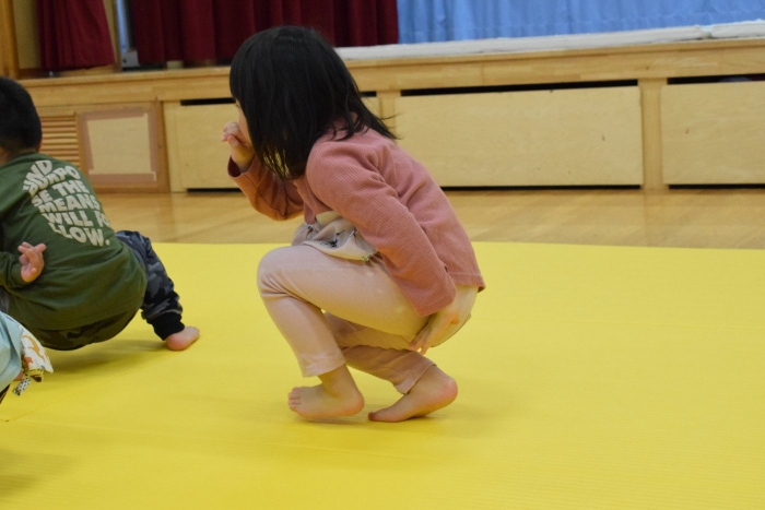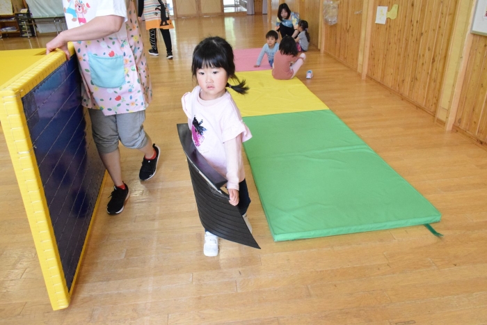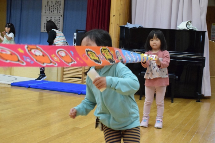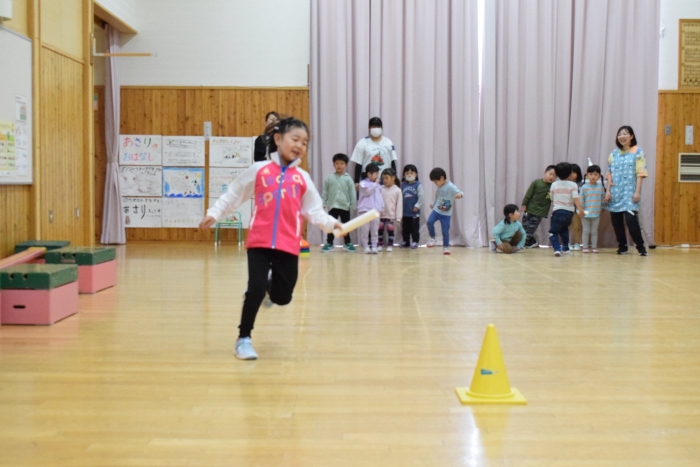 トイレットペーパーの芯をバトンに見立ててリレー遊びを始めていました。身近な物でなんでも代用して遊べるところが面白い!(^^)! 遊びの中で競技の内容を覚えていっています。