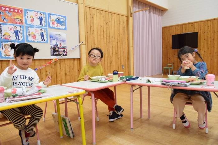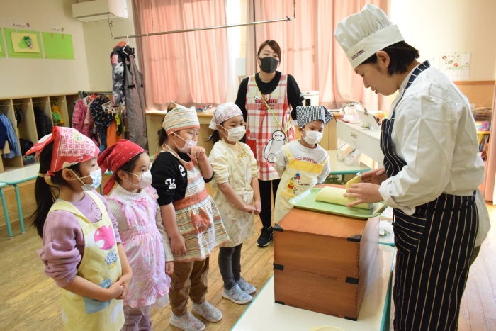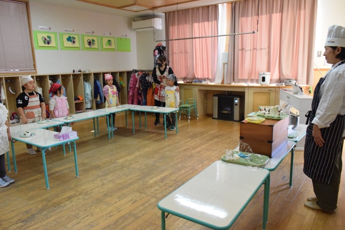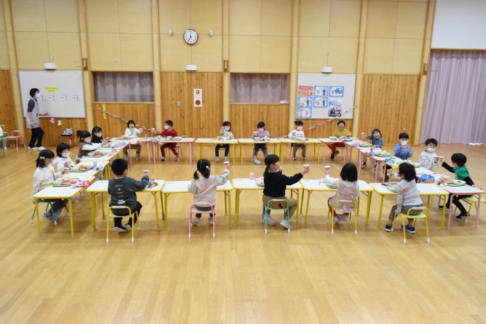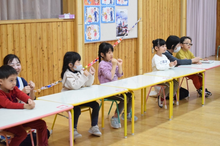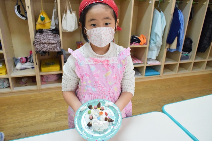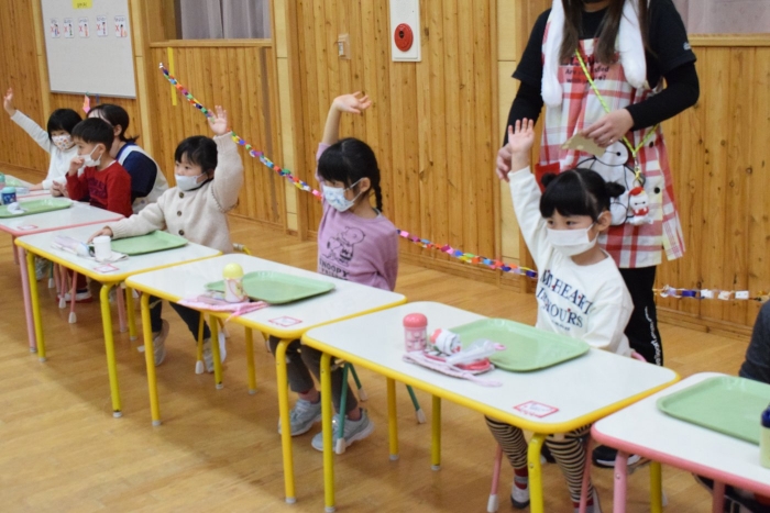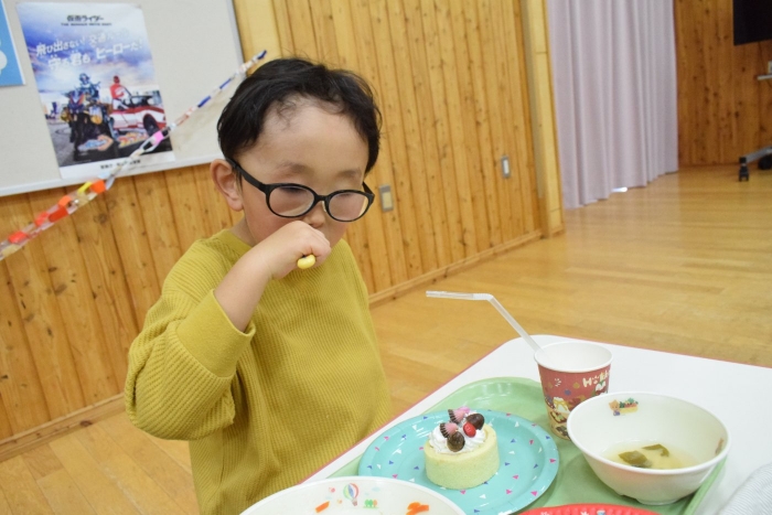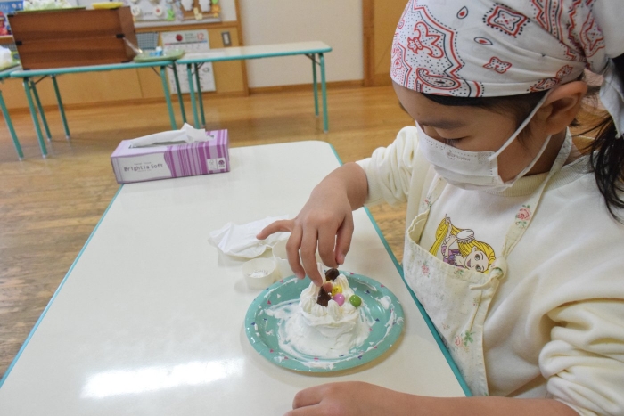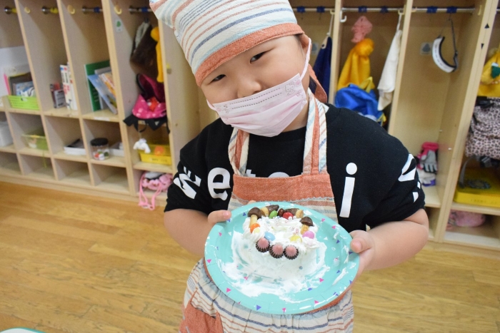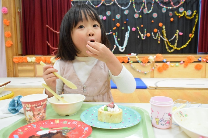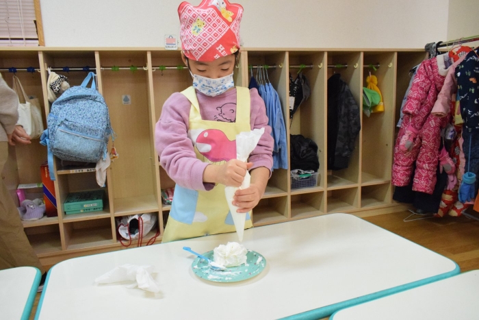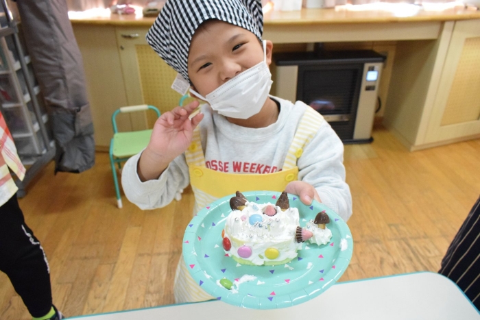 さくらさんがケーキを作っている間にうめ、ももさんは昨日作った輪飾りを使ってパーティー会場をきれいに飾り付けしましたよ! うめさんは飾り付けがよっぽど楽しかったらしく帰りの振り返りでも「○○ちゃんとキラキラ飾ったのが楽しかったです!」「きれいになってうれしかったです!」と発表していましたよ(*^-^*) 雰囲気が盛り上がったところでパーティーの始まり始まり~(^^♪