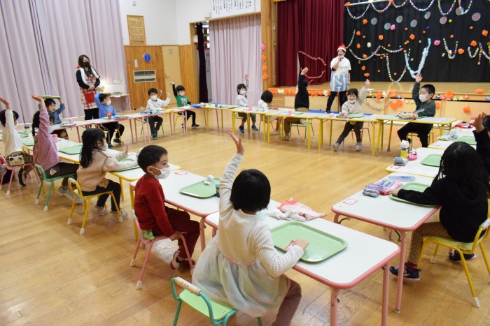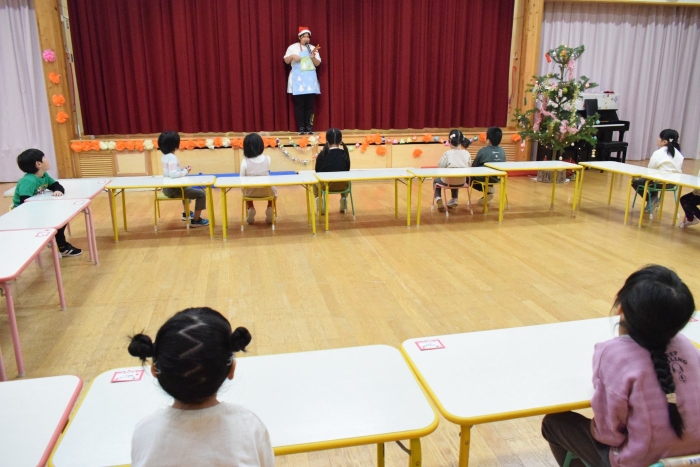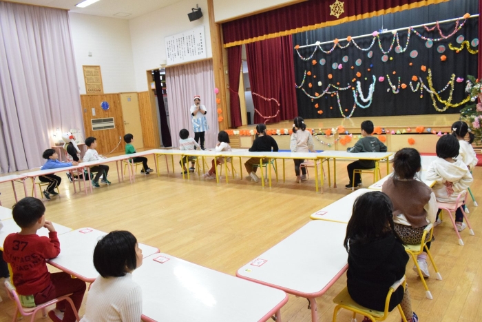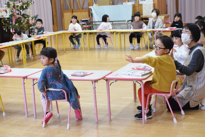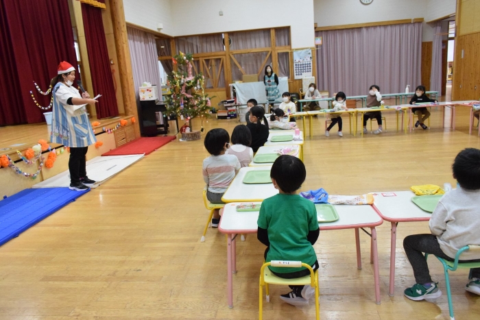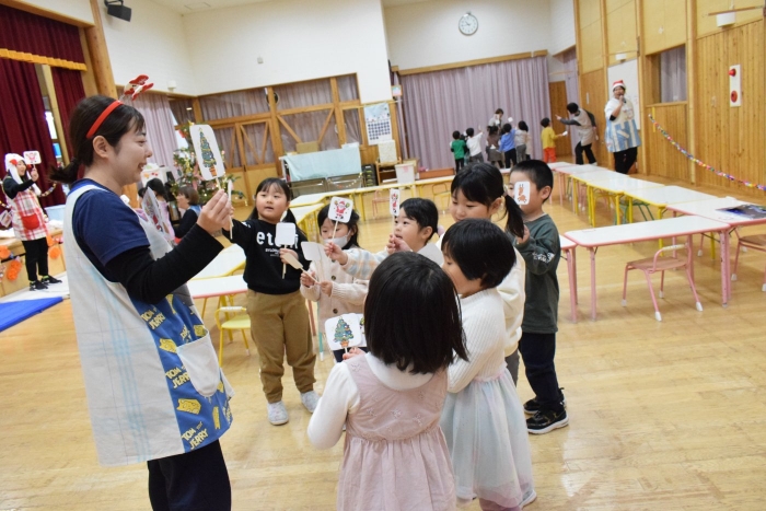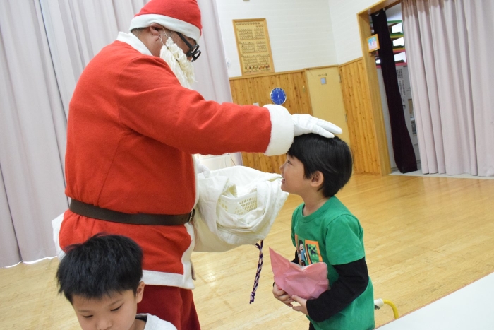 A先生が始めは『サンタさん用意はできた?』のエプロンシアターをやってくれました。次は『なにがでるかな1,2,3,ポン』ゲーム、最後にクイズをして盛り上がりましたよ!(^^)! 景品のプレゼントに大興奮でしたよ(*^-^*)