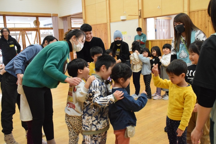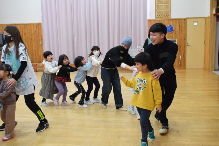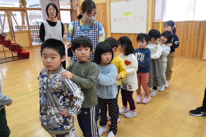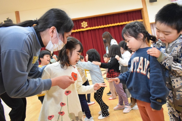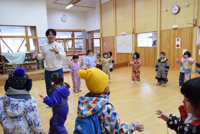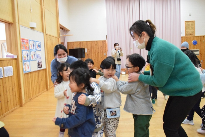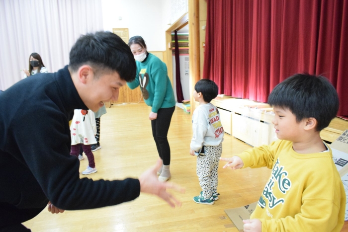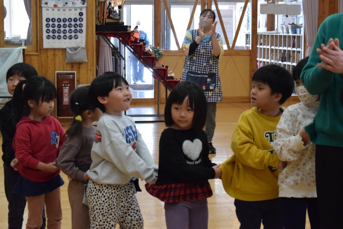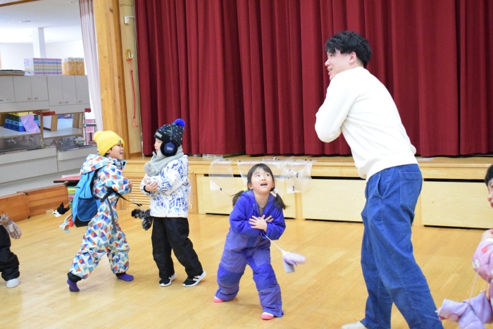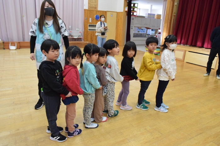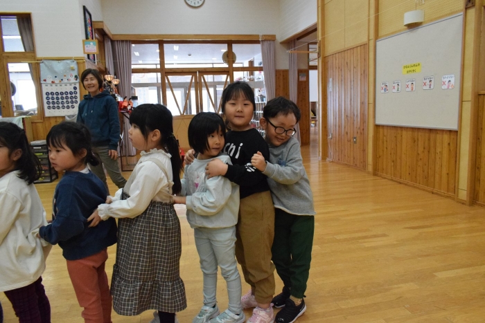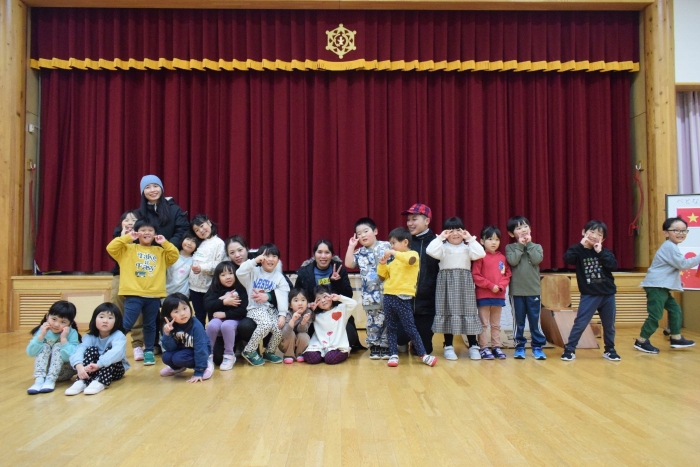 尾岱沼には働きに来ているベトナムの方が200人ぐらいは居て、その中で日本の方と結婚して永住する方もいるそうです。そんなにたくさんの方がいるのに園児たちとはあまり関わりも無く、接触する機会もなかったのでもったいない!との思いから、マルイ佐藤海産さんのご協力の下、今回その機会を設けていただきました。世界にはいろいろな国があること、いろいろな言葉があること、いろいろな文化があること・・・を、幼児期に漠然とでも感じられたらいいなと思っています。