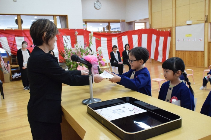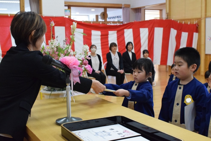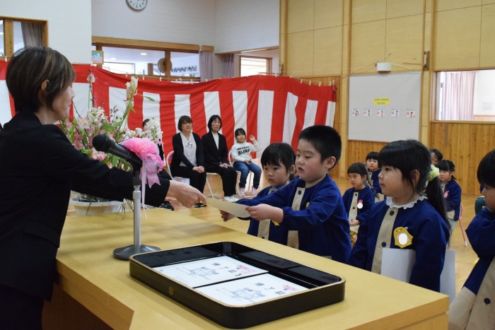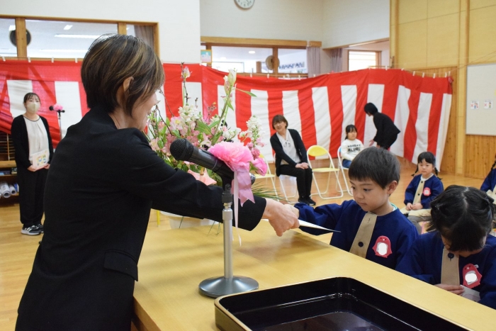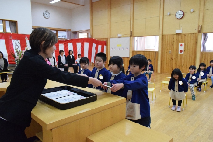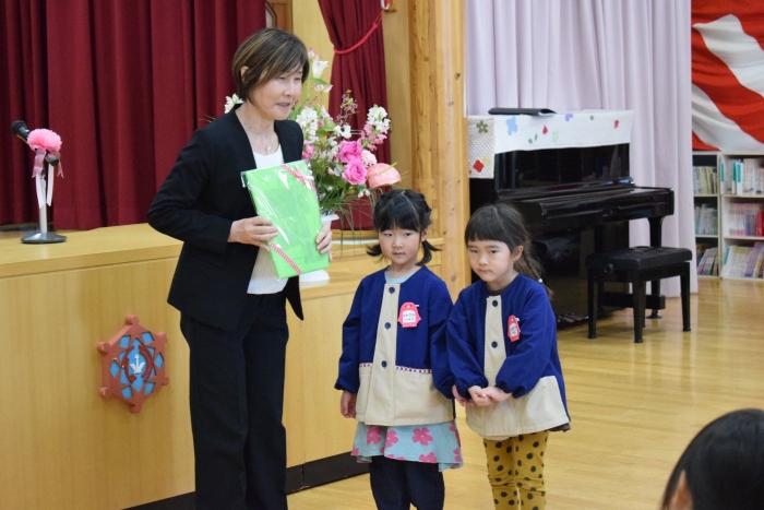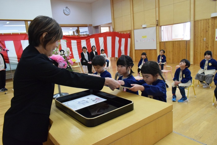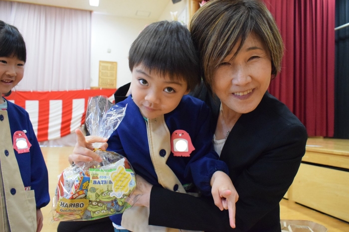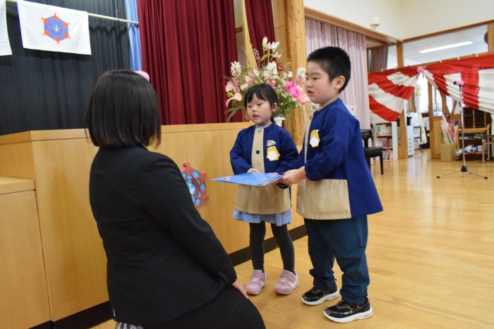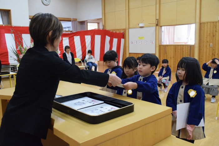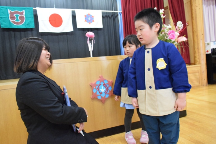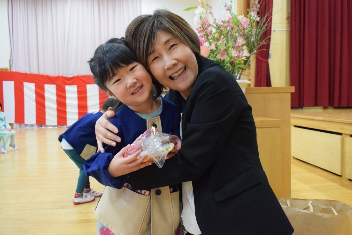 園長は「この証書には『お友だちと仲良く遊べるようになったこと』『給食も好き嫌いしないでなんでも食べられるようになったこと』『お昼寝も泣かないで寝られるようになったこと』などがたくさん詰まってます、それを成長といいます。みなさんが成長したのでこの証書がもらえました。一年間よく頑張りました!」とお話しました。ご家庭でも一年間の頑張りを褒めてあげてください。