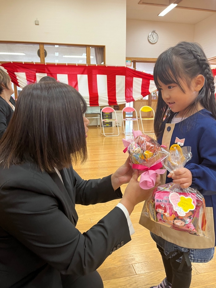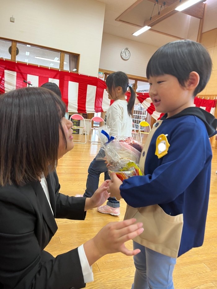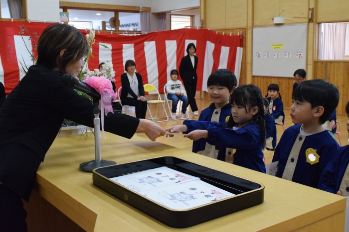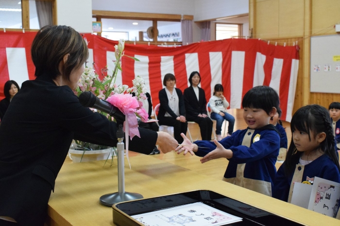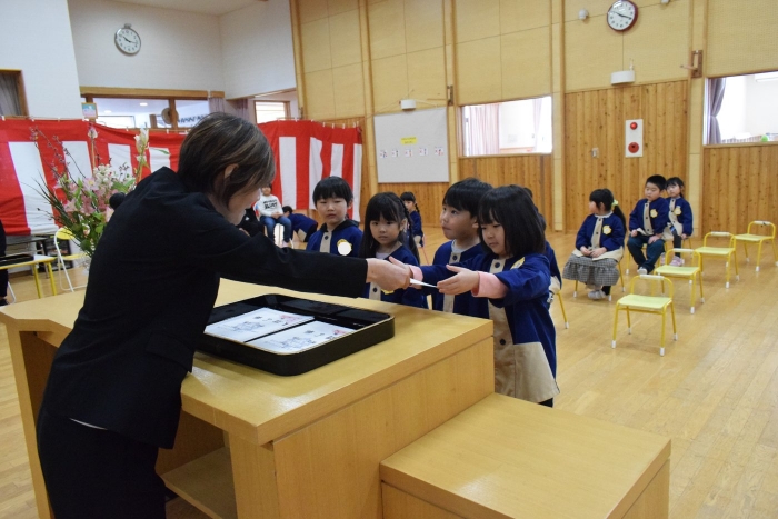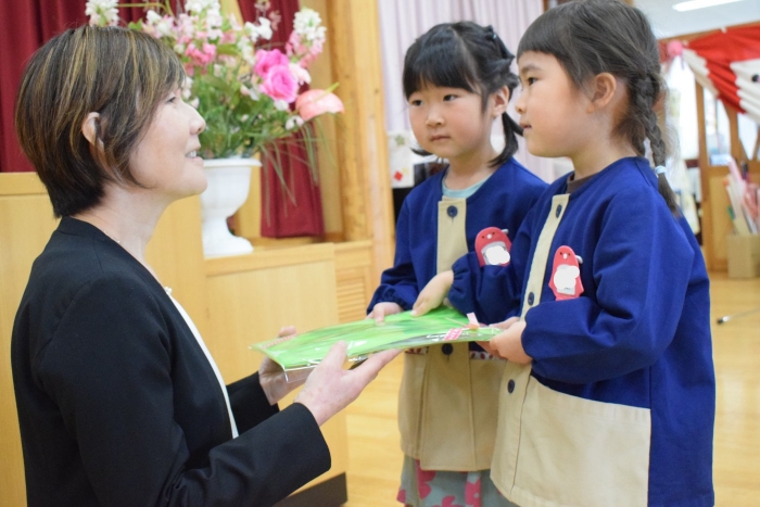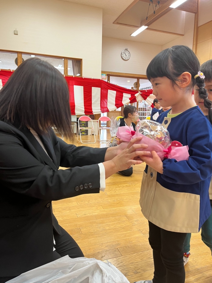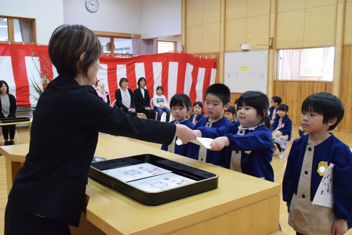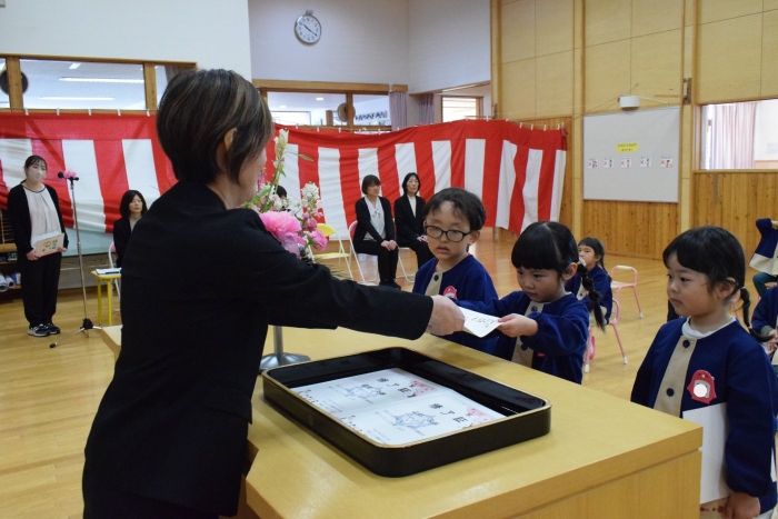 園長は「この証書には『お友だちと仲良く遊べるようになったこと』『給食も好き嫌いしないでなんでも食べられるようになったこと』『お昼寝も泣かないで寝られるようになったこと』などがたくさん詰まってます、それを成長といいます。みなさんが成長したのでこの証書がもらえました。一年間よく頑張りました!」とお話しました。ご家庭でも一年間の頑張りを褒めてあげてください。