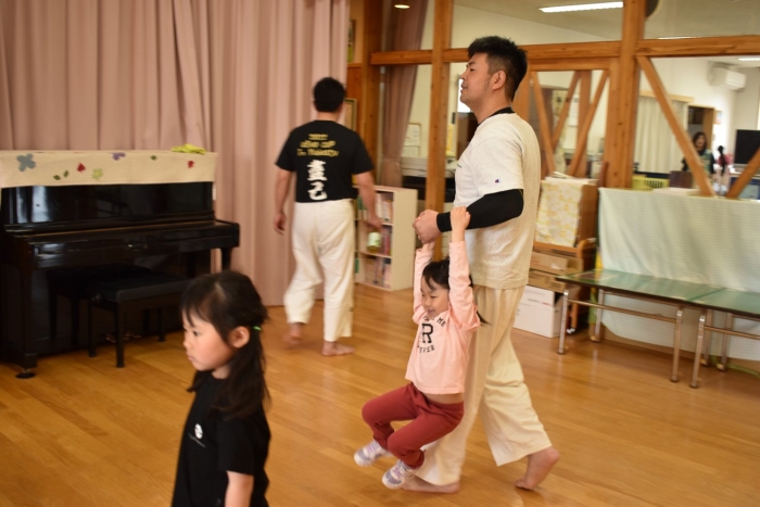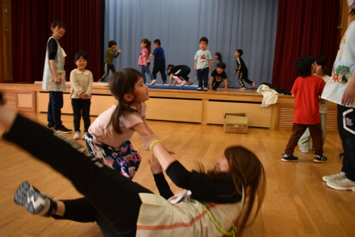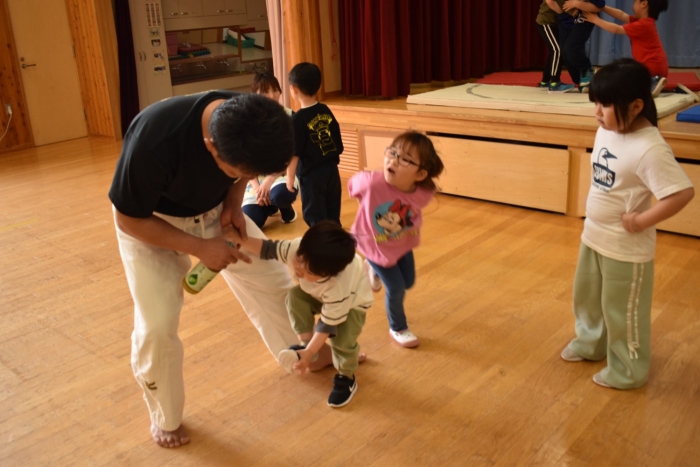 子どもたちが投げた風?に投げられてくださった講師の方の技術の
