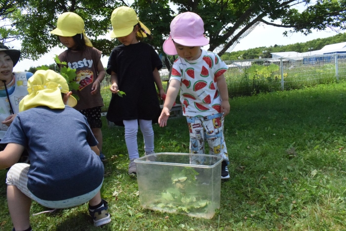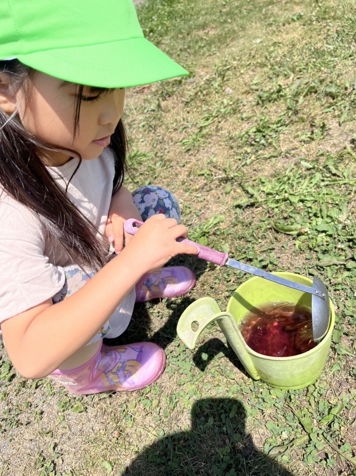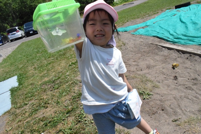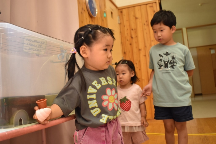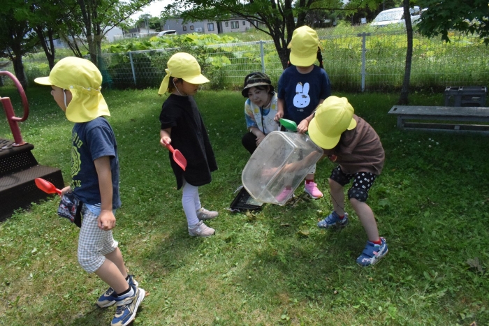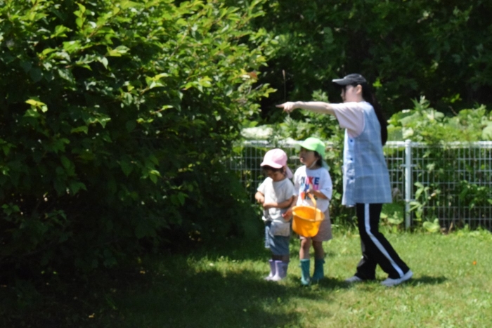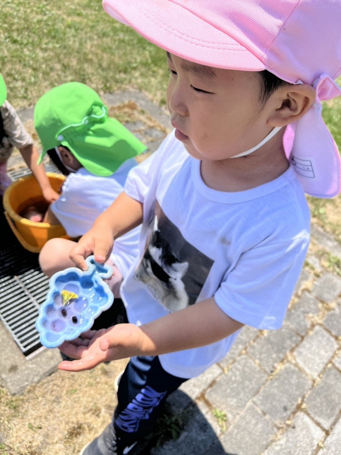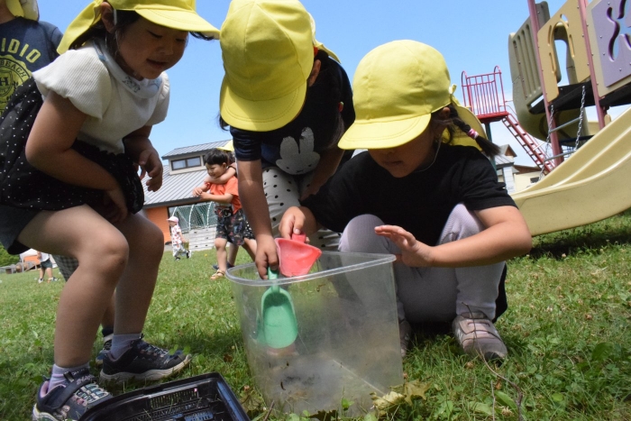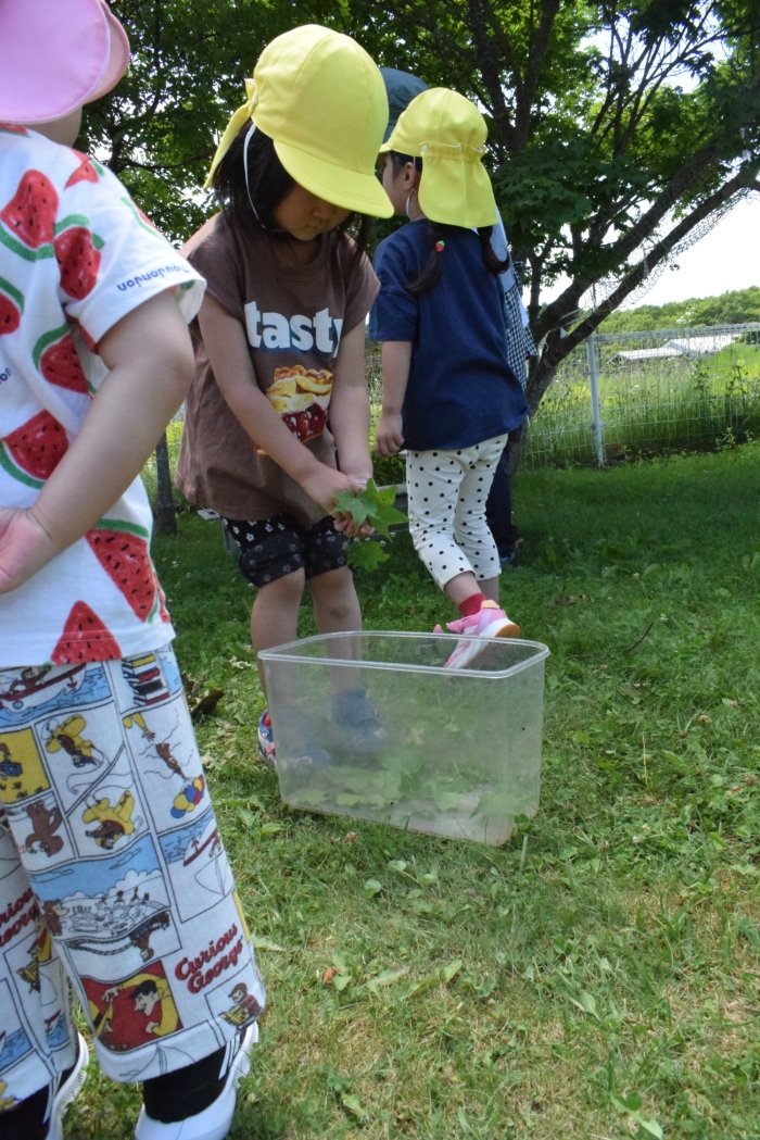 今日は昨日に比べるとだいぶ涼しくて過ごしやすかったですね。園開放日のお友達も外に出てきてくれて一緒に遊ぶことができました。花壇の花や,さくらの実をつぶして色水作りをしたりするお友達もいました。きれいなあかむらさき色になった色水を大切にしていましたよ。もも組さんはお部屋で飼っていた毛虫を逃がしてあげていたようです。毛虫に驚いてしまった園開放日のお友達もいたようです。写真のみご紹介しますね。